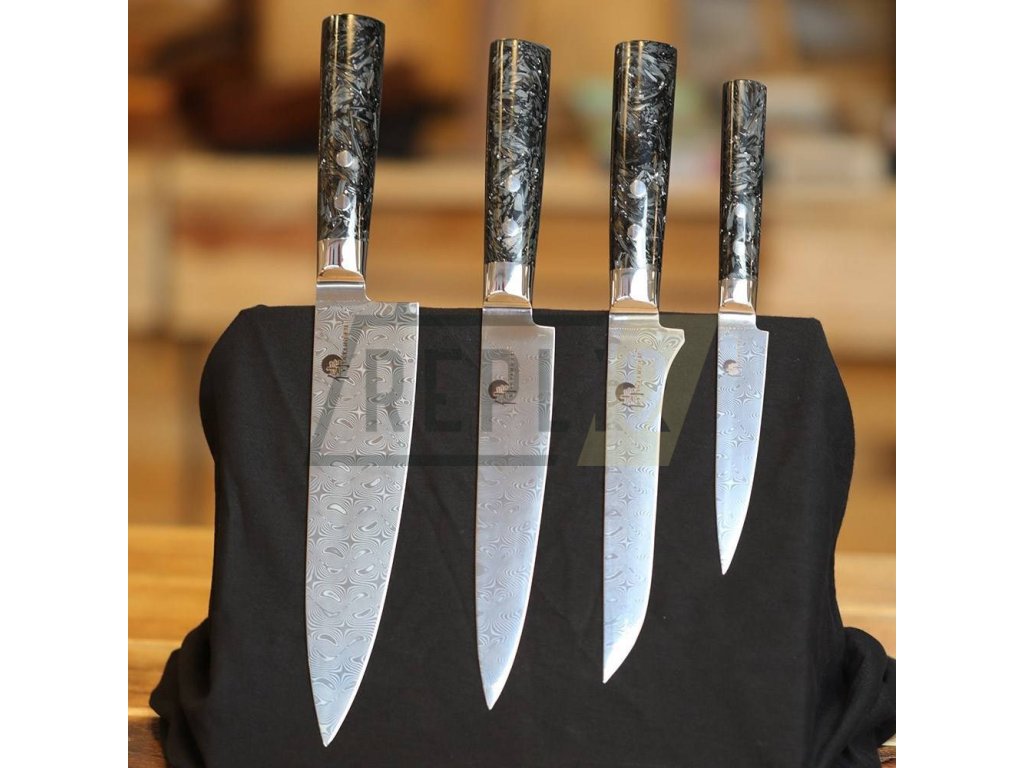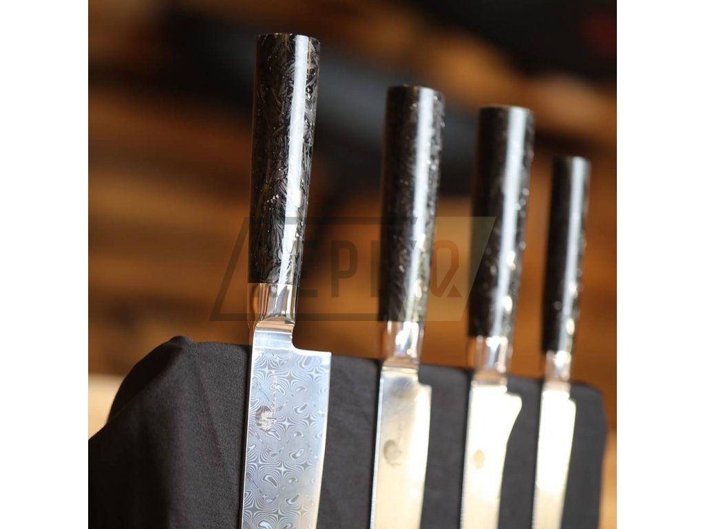 Nože z řady Dellinger Carbon Fragment jsou symbolem blízké budoucnosti. Začátek nového věku a revoluce ve výrobě a zpracování moderních nožů. Ostrá čepel je tvořena 110 vrstvami dvou tvrdých nerezových a prokovaných ocelí. Čepel těchto nožů prochází kalením ve velmi přesných vakuových pecích (vacuum heat treatment) a následně je ochlazena dusíkem. Každý nůž je ručně broušený pod úhlem 12-15° a při tvrdosti okolo 60 HRC dosahuje mimořádné až extrémní ostrosti. Nože z této oceli se mimořádně hodí pro venkovní kuchyně a BBQ. Pro krájení a sekání zeleniny, masa a kostí je to klíčový nástroj bez kterého se už nikdy neobejdete. Houževnatá damašková ocel bez jádra (full Damascus) splní veškeré Vaše představy o moderním a ostrém noži.