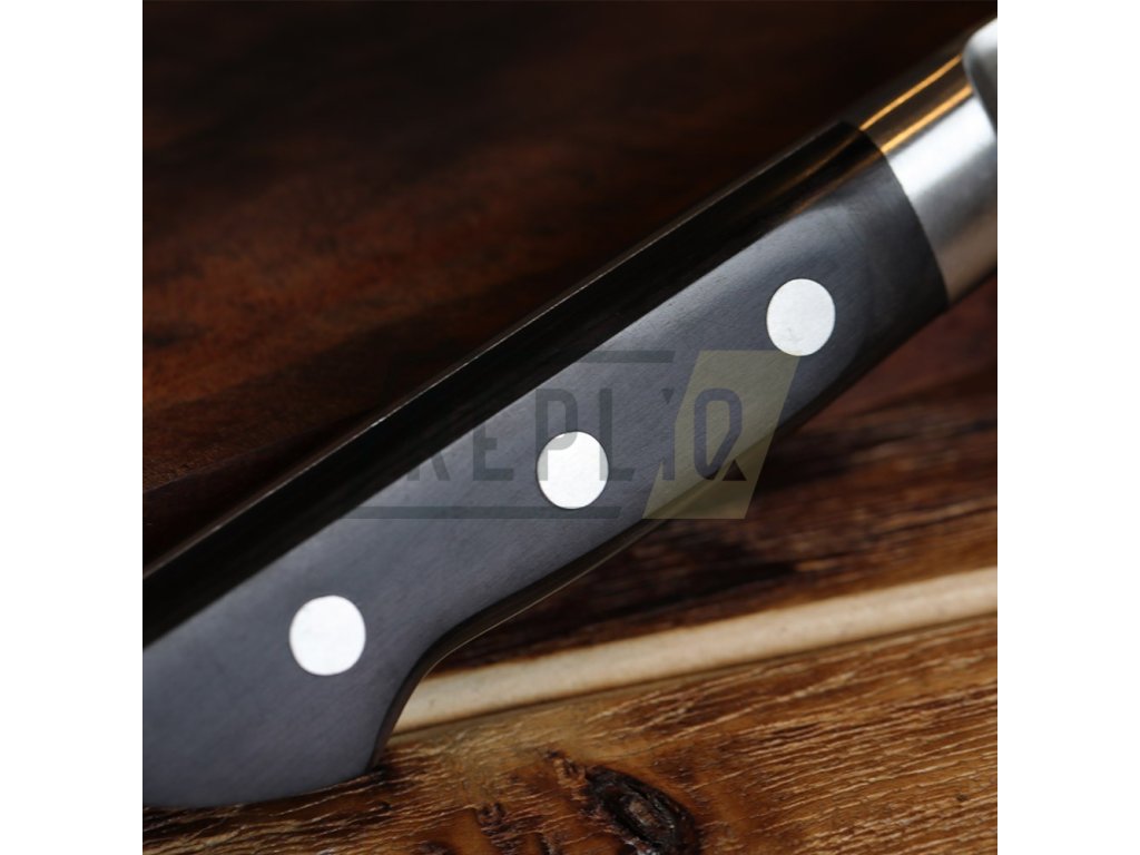 Série nožů Kanetsune Honsho Kanemasa E-series kombinuje dokonalou funkčnost, ergonomii a jedinečný japonský smysl pro design. Každý nůž je ručně broušený a při tvrdosti jádra 60-61 HRC dosahuje mimořádné až extrémní ostrosti. Je to mistrovské dílo, které pochází z „města nožů“ Seki-City v Japonsku. Použití oceli SK-95 a moderní technologie vám zaručí nejvyšší možnou kvalitu mezi ručně vyráběnými noži. Díky sníženému obsahu uhlíku je čepel nejen cenově dostupnější, ale také o něco tvrdší a méně náchylná k odštípnutí, přičemž si stále zachovává skvělé vlastnosti vysokouhlíkové čepele. Jsou to skvělé nože vhodnější pro náročnější kuchyňské práce, například v rušné profesionální kuchyni. Klasická západní rukojeť z černého Plywood je spojena s ostřím 3 nýty, což zajišťuje dokonalou pevnost a poskytne tu nejlepší kontrolu při řezání a krájení.