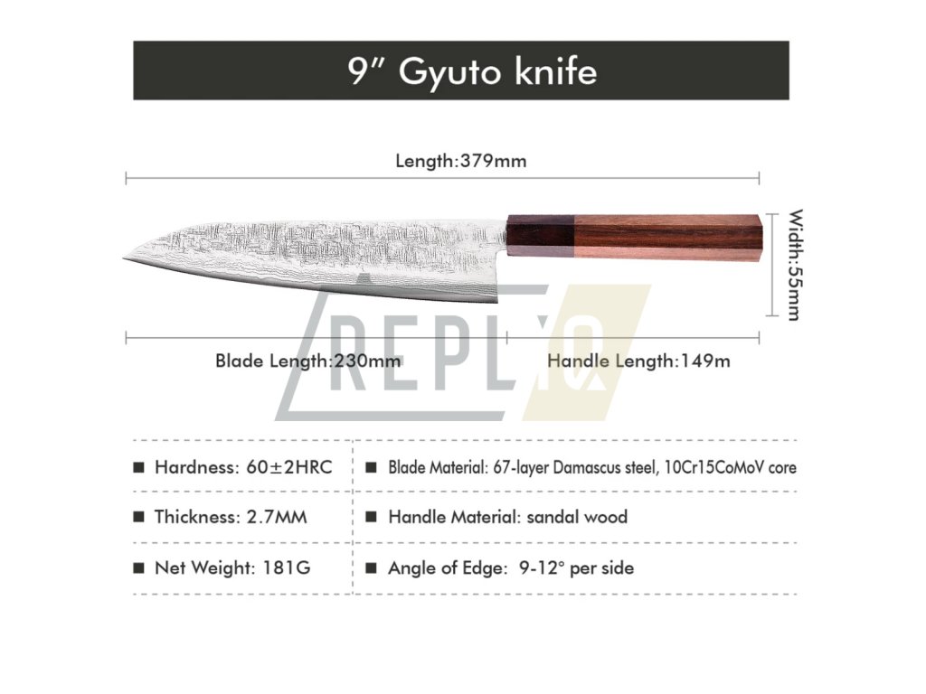 Nůž gyuto/Chef je ideální pro všestranné využití. Díky tomu, že se hřbet nože a ostří zužují do špičky, má ideální tvar pro každý druh krájení. Je vhodný pro porcování masa, krájení ryb, plátkování, čištění masa a ryb, ovoce a zeleniny. Výše položený hrot Vám umožní i kolébkové krájení bylinek nebo ořechů. Název „Gyuto“ znamená doslova „kráječ masa“, což naznačuje jeho původní účel, ale tento nůž je dnes ceněn pro svou schopnost zvládnout širokou škálu kuchyňských úkolů.