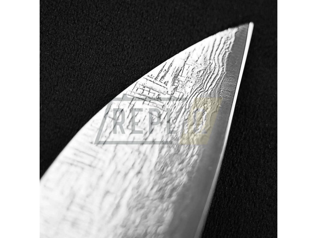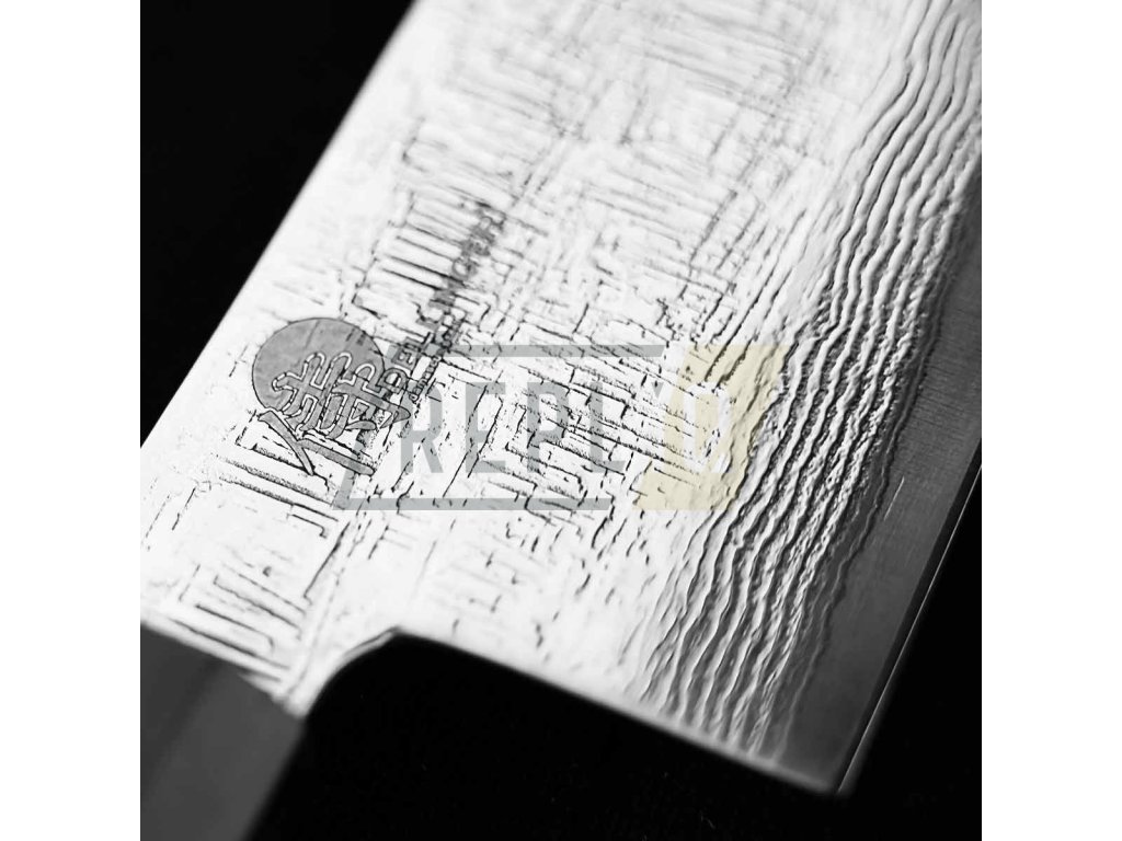Jádro čepele je vyrobeno z damascénské oceli s tvrdostí 61±1 HRC, obklopené 66 vrstvami dvou druhů nerezové oceli. Toto vrstvení zajišťuje maximální houževnatost a odolnost. Surový vzor ručně kovaného damašku. Neuhlazený, živý povrch s výraznou kresbou vrstev oceli odhaluje skutečný charakter řemeslné výroby a dává každému noži jedinečnou identitu. Precizní zpracování zaručuje snadnou údržbu a dlouhotrvající ostrost, kterou lze snadno obnovit broušením na vodních kamenech.