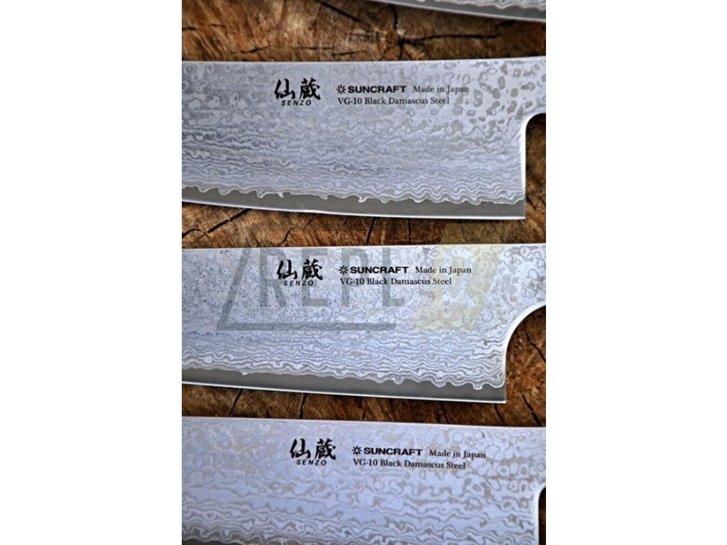 Nože ze série Suncraft VG-10 Black Damascus mají ultra ostré řezné jádro z japonské oceli VG-10, které je velmi dobře chráněno proti korozi. Japonská ocel VG-10 má dlouhotrvající ostrost při tvrdosti R62 +/-1 Rockwella. Jádro z japonské oceli VG-10 je vloženo mezi 66 vrstev 2 nerezových damascénských ocelí, které zajišťují mimořádnou odolnost a houževnatost. Dokonale vyvážená, přesně zúžená čepel japonského tvaru s třpytivým damascénským vzorem minimalizuje tření při řezu a zabraňuje přilepení krájeného materiálu k čepeli. Damascénský vzor je jedinečný a neopakovatelný.