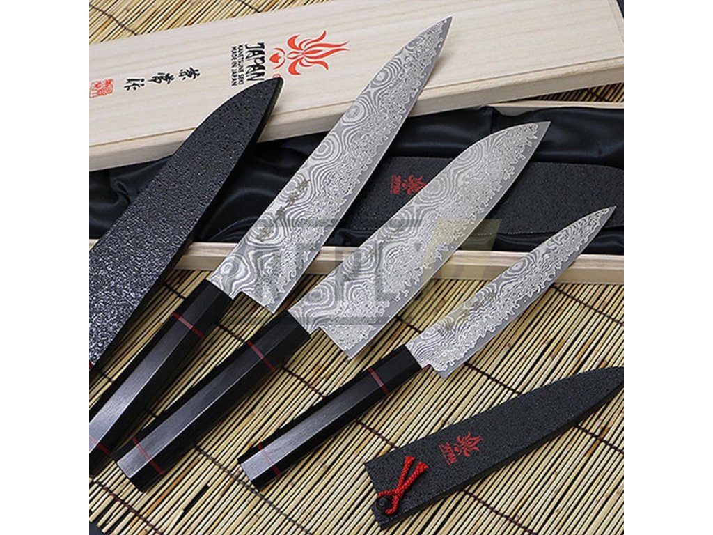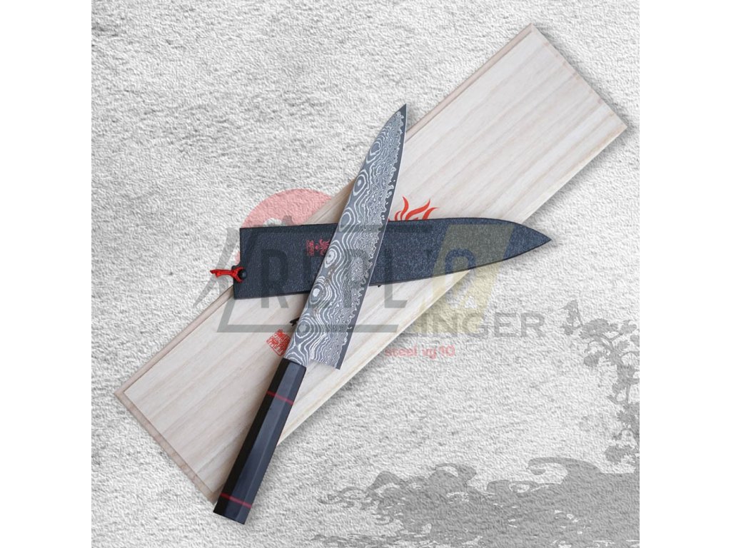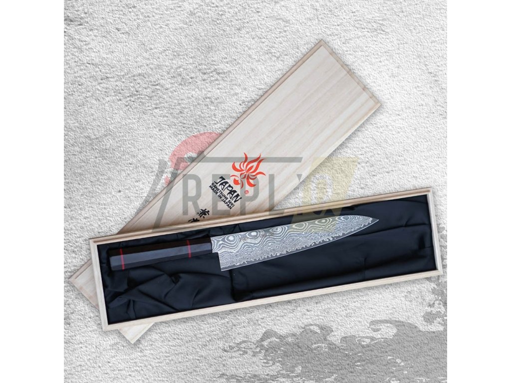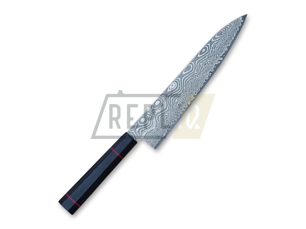 Velmi ostrý japonský nůž Gyuto/Chef ze série Kanetsune Damascus Namishibuki series z japonské damaškové oceli. Hřbet nože a ostří se zužují do špičky pro všestranné využití mimořádné řezné síly. Krájení, plátkování, čištění masa, ovoce a zeleniny – nic nebude pro tento jedinečný nůž japonského tvaru problémem. Kuchařský nůž Gyuto je díky výše položenému hrotu, též vhodný ke kolébkovému krájení bylinek, zeleniny a ořechů. Dlouhá čepel a oktagonoá rukojeť poskytne tu nejlepší kontrolu při řezání a krájení. Nepřekonatelné vlastnosti nože oceníte například při krájení cibule. Ostrost čepele zajistí minimální únik tekutiny a vaše pokrmy budou plné šťávy a vitamínů.
