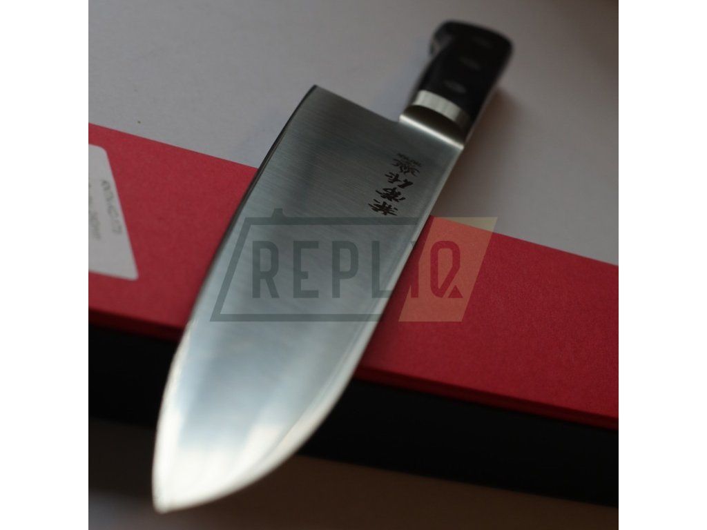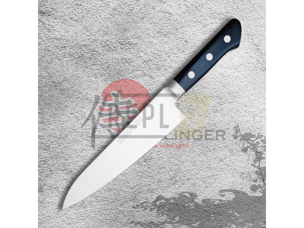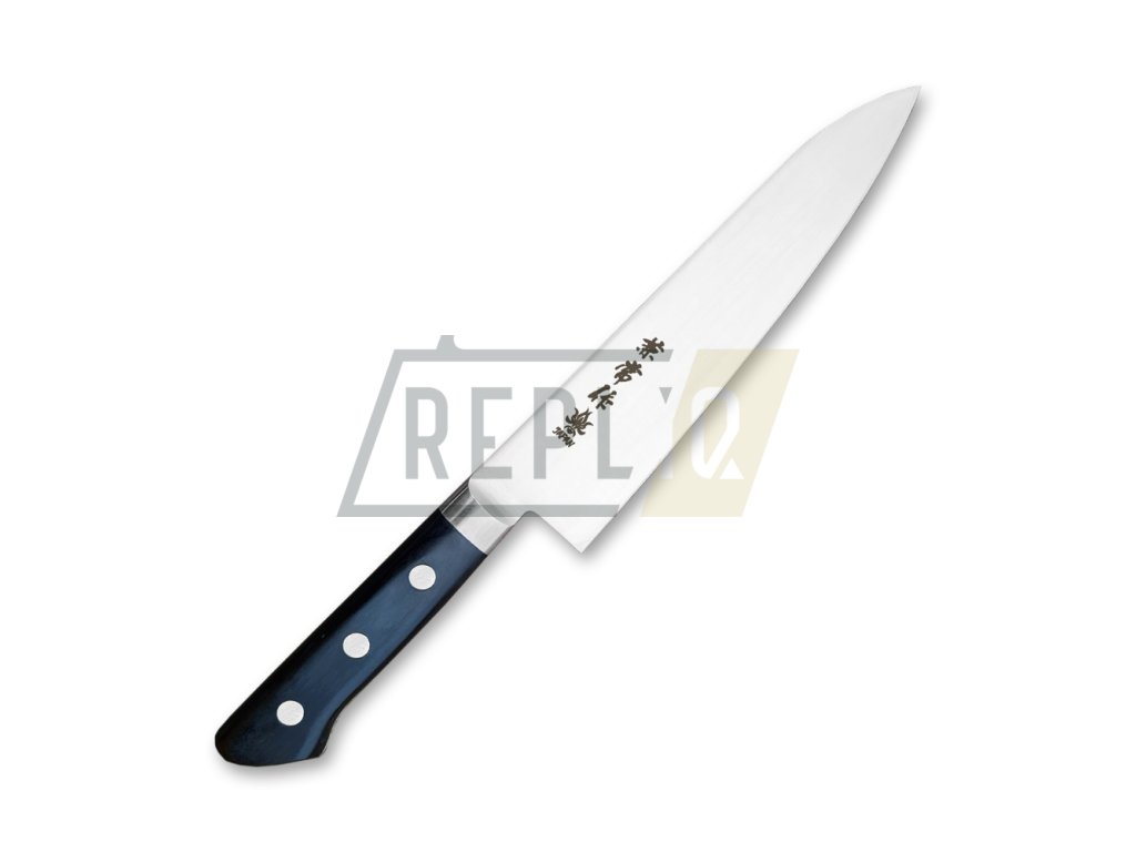 Velmi ostrý nůž šéfkuchaře Gyuto ze série Kanetsune AUS 10 PRO series. Čepel je vyrobena z kvalitní japonské nerezové oceli AUS-10, která obsahuje 0,95 - 1,10% uhlíku a dobře vyvážené složení molybudenu, vanadu a dalších legur. Tato nerezová ocel má vynikající odolnost proti korozi a houževnatost, tvrdost je HRC 59-60. Základní a jednoduchá rukojeť z materiálu Plywood má vynikající přilnavost a vysokou odolnost proti opotřebení. Fulltangová konstrukce (čepel nože prochází celým nožem a rukojeť je pronýtována 3 nýty) zaručuje celkovou konstrukční pevnost.