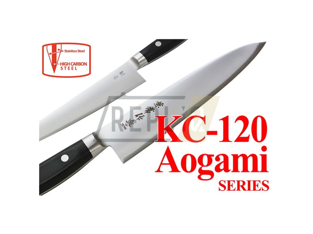 Serie nožů Kanetsune KC-120 Aogami kombinuje dokonalou funkčnost, ergonomii a jedinečný japonský smysl pro design. Každý nůž je ručně broušený a při tvrdosti jádra 61-62 HRC dosahuje mimořádné až extrémní ostrosti. Je to mistrovské dílo, které pochází z „města nožů“ Seki-City v Japonsku. Použití oceli Blue steel a moderní technologie vám zaručí nejvyšší možnou kvalitu mezi komerčně vyráběnými noži. Velmi tvrdé jádro z oceli Blue Steel je kryto z každé strany nerezovou ocelí SUS410. Klasická západní rukojeť z černého Plywood je spojena s ostřím 3 nýty – což zajišťuje dokonalou pevnost a poskytne Vám tu nejlepší kontrolu při řezání a krájení.