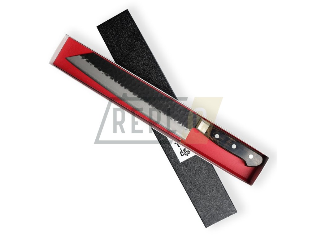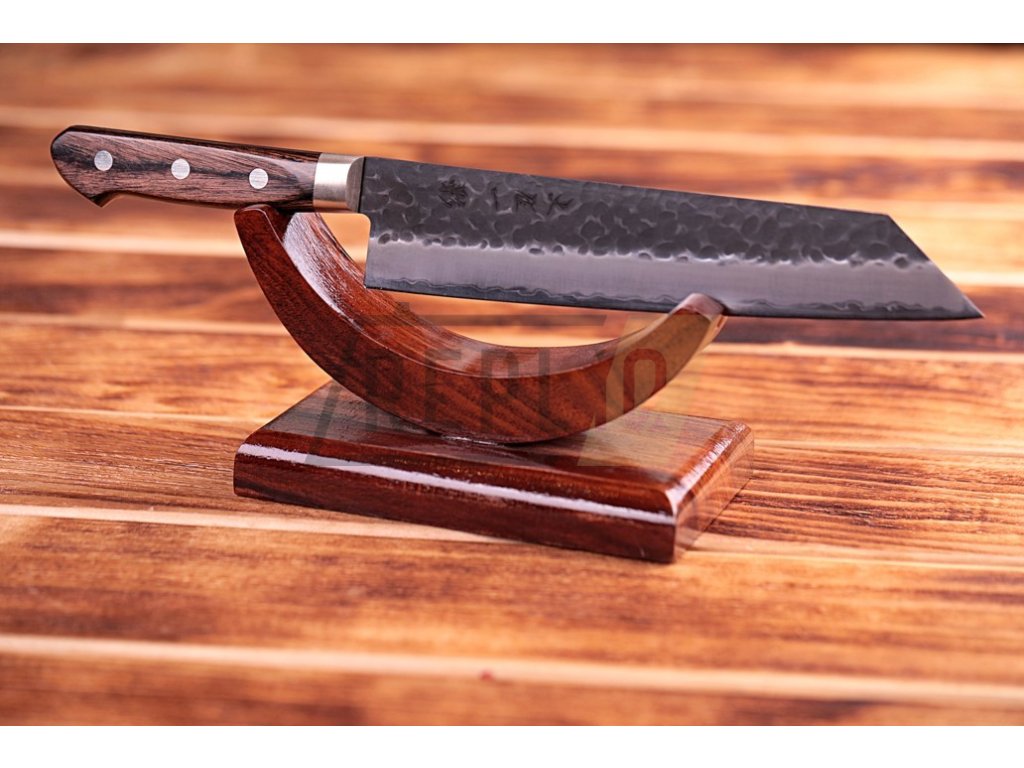 Velmi ostrý japonský nůž Kiritsuke ze série Hokiyama Tosa-Ichi Tsuchime Black z japonské oceli AOGAMI SUPER (Blue Super Steel). Hřbet nože a ostří se zužují do špičky pro všestranné využití mimořádné řezné síly. Krájení, plátkování, čištění masa, ovoce a zeleniny – nic nebude pro tento jedinečný nůž japonského tvaru problémem. Kuchařský nůž Kiritsuke je díky výše položenému hrotu, též vhodný ke kolébkovému krájení bylinek, zeleniny a ořechů. Dlouhá čepel a evropský styl rukojeti Vám poskytne tu nejlepší kontrolu při řezání a krájení. Dokonale vyvážená čepel s povrchovou úpravou Tsuchime (kladívkový povrch) dává noži nejen skvělý vzhled, ale také zabraňuje přilepení krájeného materiálu k čepeli. Ostrost čepele zajistí minimální únik tekutiny a vaše pokrmy budou plné šťávy a vitamínů. Japonské umění a nové technologie činí tento nůž jedinečným a nenapodobitelným.