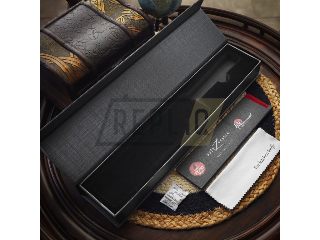 Luxusní dárkové balení nože výrazně zvýší celkovou hodnotu a dojem z daru. Následnou personalizací (laserem) a přidáním elegantních detailů, jako je stužka nebo mašle, vytvoříš nezapomenutelný dárek, který zaujme obsahem i prezentací. V krabičce najdeš hadřík na leštění a kryt ostří pro bezpečné uskladnění.
