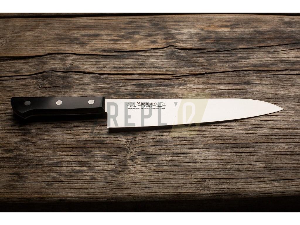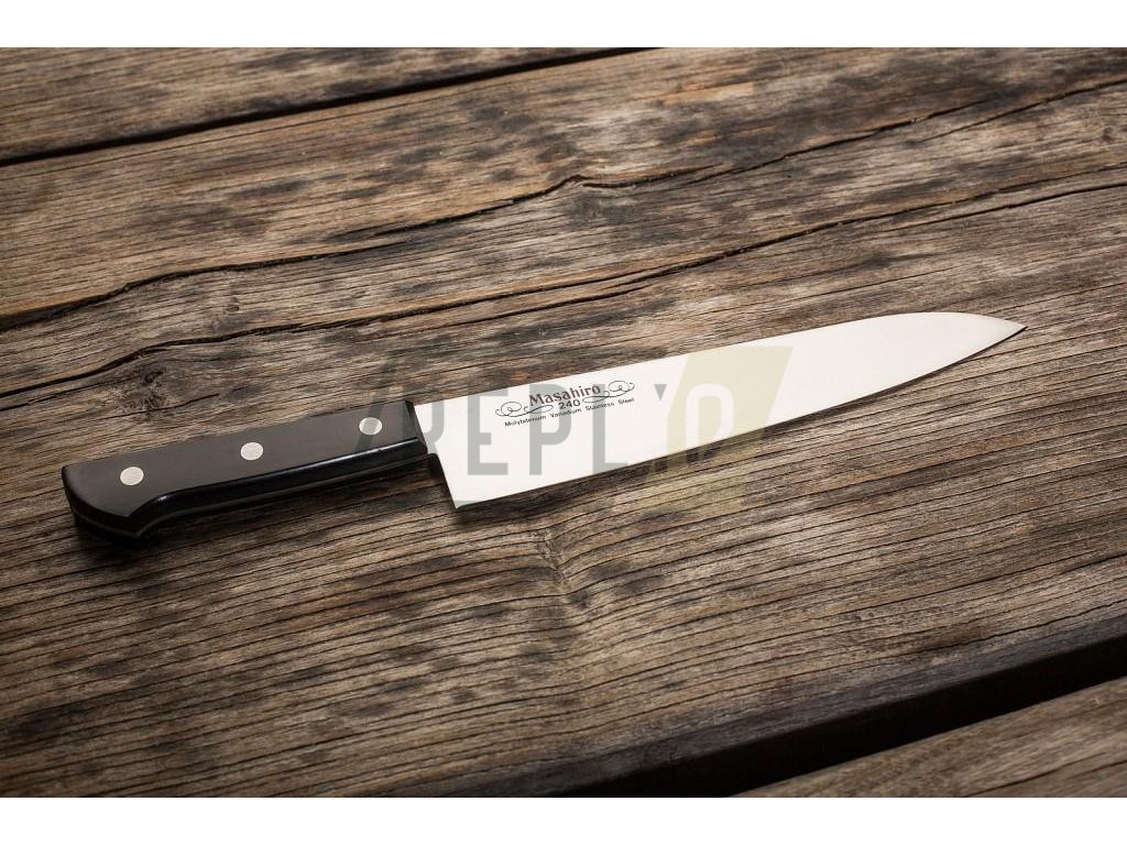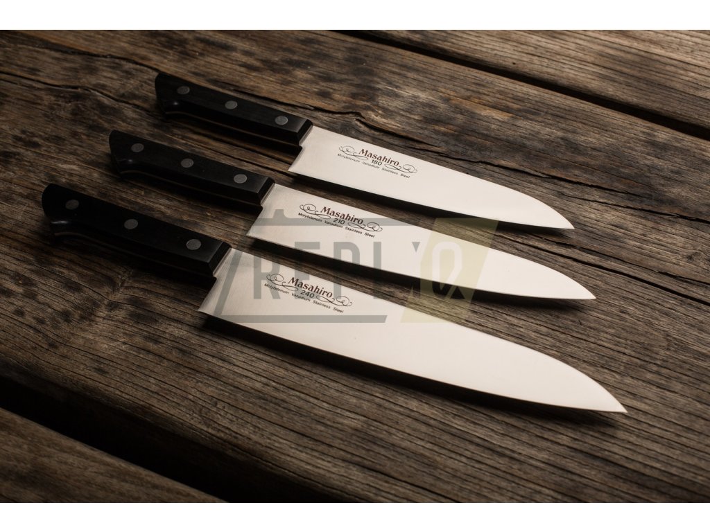 Masahiro BWH Šéfkuchař s délkou čepele 240 mm je jedním z nejčastěji volených nožů do kuchyně, a to jak profesionálními, tak amatérskými kuchaři. Charakteristický tvar nože, který pochází z francouzské kuchyně, se používá k mnoha kuchyňským pracím a název kuchařský nůž podtrhuje skutečnost, že je nepostradatelným nástrojem každého kuchaře. Nůž je velmi lehký a rukojeť dobře padne do malé i velké ruky. Díky dokonalému vyvážení čepele a rukojeti umožňuje rytmický, velmi účinný kývavý pohyb po povrchu při krájení nebo sekání různých produktů.
