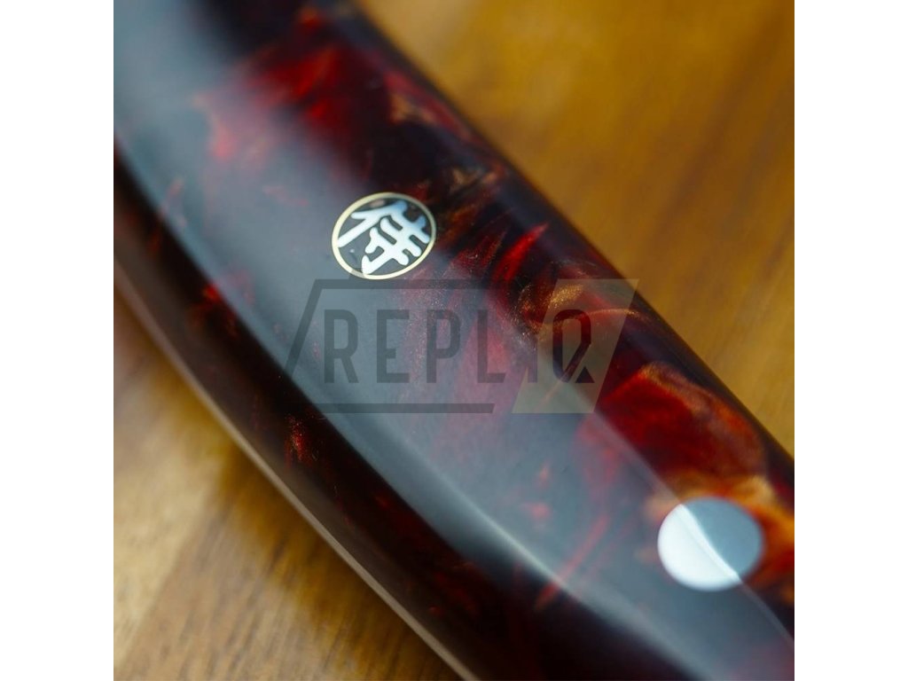 Rukojeť je vyrobena z překrásné epoxidové pryskyřice. Jedná se o průhlednou pryskyřici probarvenou alkoholovými pigmenty, které mohou časem měnit barvu. Navíc je ozdobená středovým mozaikovým nýtem se znakem samurajů. Trojité nýtování zajišťuje dokonalou pevnost, stabilitu a spojení damaškového ostří a rukojeti. Rukojeť je pečlivě ručně leštěná, ergonomicky tvarovaná a navržená pro vynikající ruční ovládání. Speciálně navržený tvar rukojeti je vhodný pro asijský úchop nože. Pryskyřice je voděodolná a zcela bez zápachu, nevyžaduje prakticky žádnou údržbu. Nezačne v průběhu času korodovat, oxidovat, zůstane stejně tvrdá a pevná.