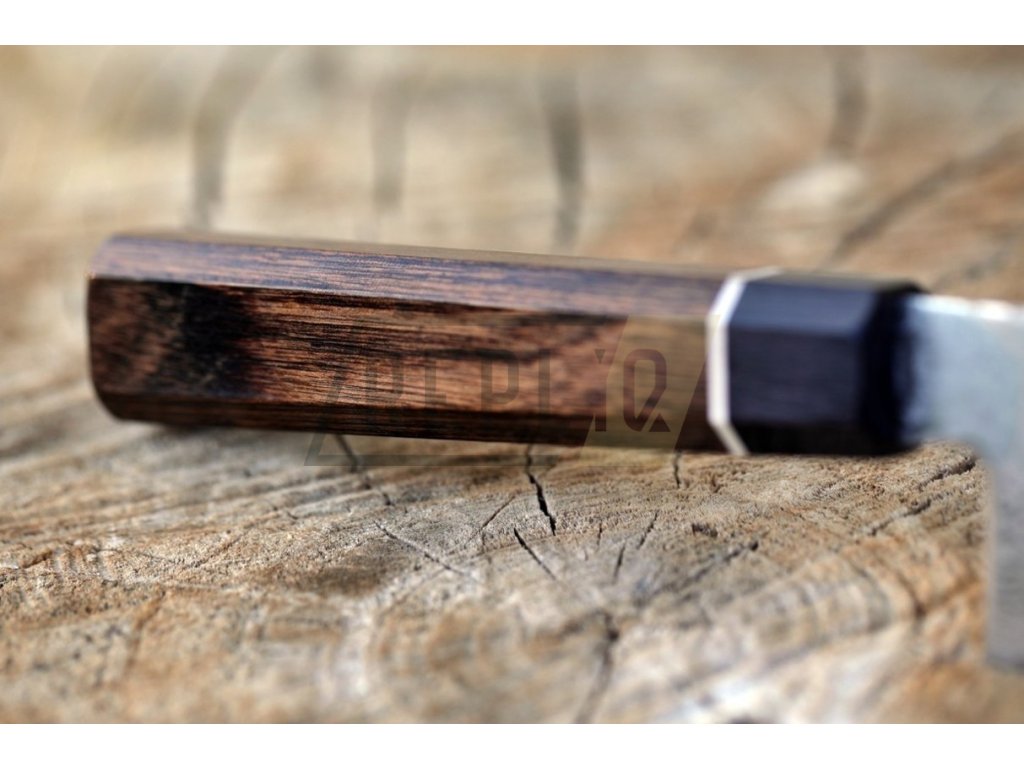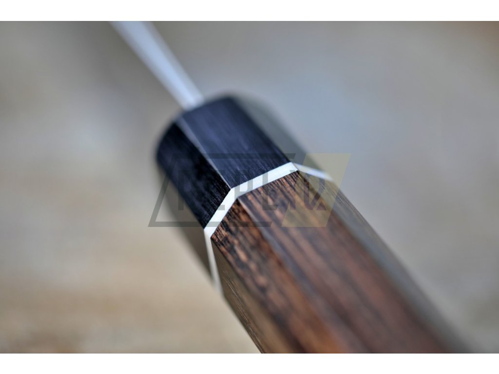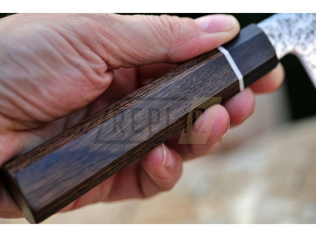 Octagonová rukojeť asijského stylu je vyrobena z materiálu Pakka-wood a je ozdobena stylovým bílým kroužkem. Vždy je pečlivě ručně leštěná, ergonomicky tvarovaná a navržena pro vynikající ruční ovládání. Materiál Pakawood je voděodolný a zcela bez zápachu. Můžete si být jisti, že tento materiál nebude v průběhu času korodovat, oxidovat nebo se nestane měkčí a křehčí. Tento materiál nevyžaduje prakticky žádnou údržbu, na rozdíl od tradičních materiálů jako je dřevo. Krásná, tmavě hnědá, osmiúhelníková dřevěná rukojeť dobře sedí ve Vaší ruce a je jedno zda jste pravák, nebo levák. Dřevo Pakka je směsí vrstveného dřeva a epoxidové pryskyřice.