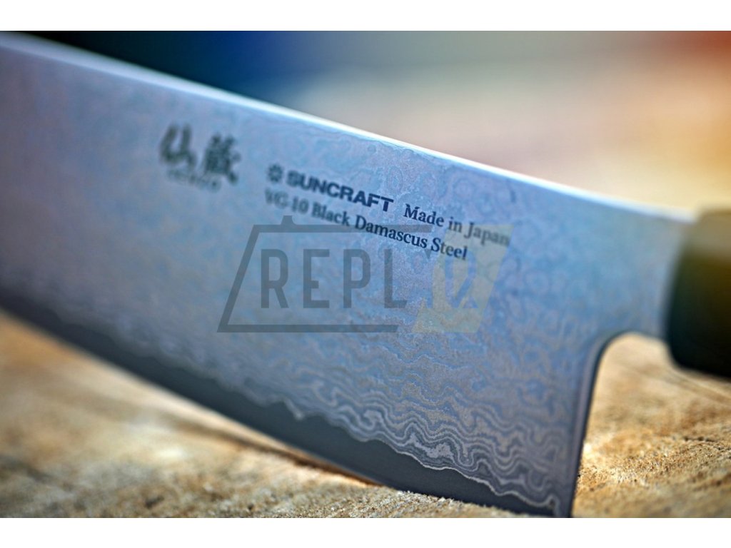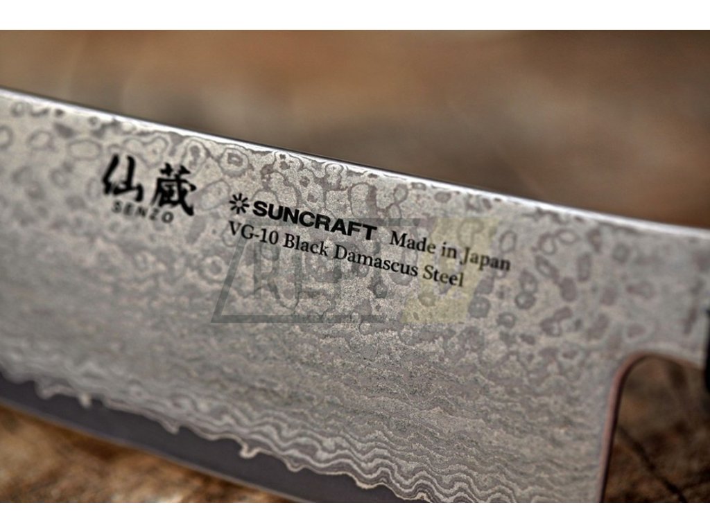Nože ze série Suncraft VG-10 Black Damascus mají ultra ostré řezné jádro z japonské oceli VG-10, které je velmi dobře chráněno proti korozi. Japonská ocel VG-10 má dlouhotrvající ostrost při tvrdosti R62 +/-1 Rockwella. Jádro z japonské oceli VG-10 je vloženo mezi 66 vrstev 2 nerezových damascénských ocelí, které zajišťují mimořádnou odolnost a houževnatost. Dokonale vyvážená, přesně zúžená čepel japonského tvaru s třpytivým damascénským vzorem minimalizuje tření při řezu a zabraňuje přilepení krájeného materiálu k čepeli. Damascénský vzor je jedinečný a neopakovatelný.