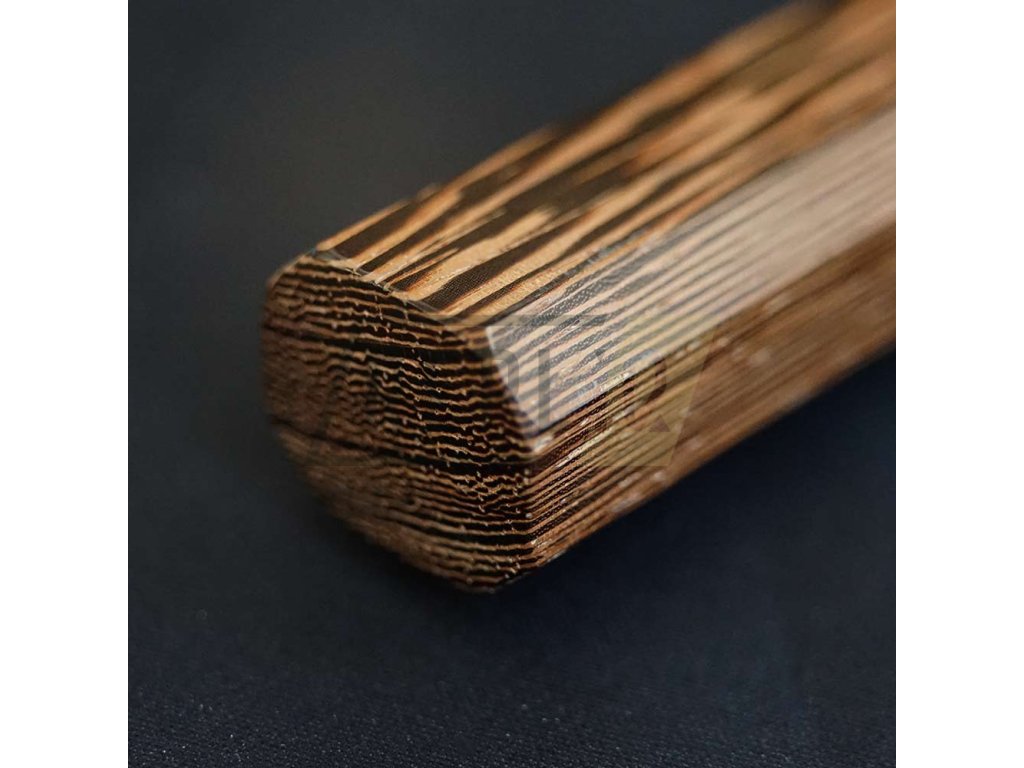 Nože jsou osazeny polokulatou osmihrannou rukojetí z exotického dřeva Wenge, doplněnou pravou buvolí rohovinou. Kombinace tmavě hnědo-černé kresby dřeva a přírodního rohového kování podtrhuje exkluzivní charakter série a zároveň zajišťuje perfektní ergonomii a vyvážení.