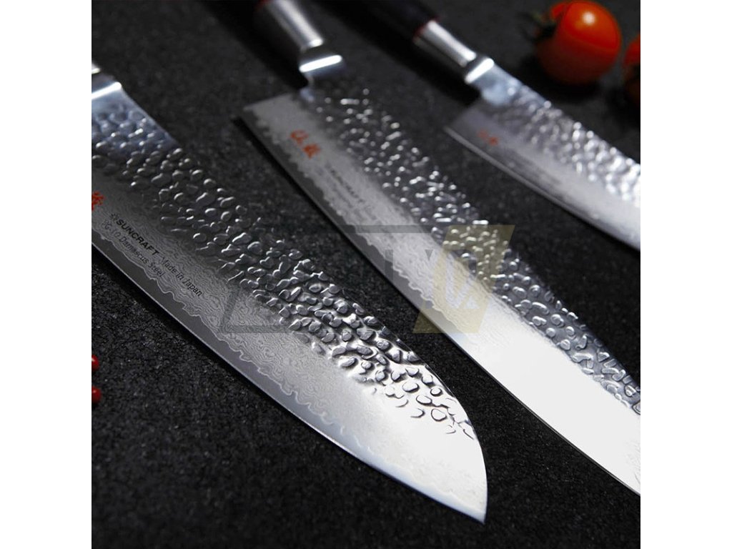 Nože Suncraft Senzo Classic Tsuchime Damascus jsou o něco těžší než standardní japonské nože. Přidaná hmotnost je výsledkem kování čepeli za studena. Obvyklá síla polotovaru před lisováním je 4 mm. Tímto procesem, který se nazývá Tsuchime (kladívkový povrch) získává nůž nejen skvělý vzhled, ale také zabraňuje přilepení krájeného materiálu k čepeli.