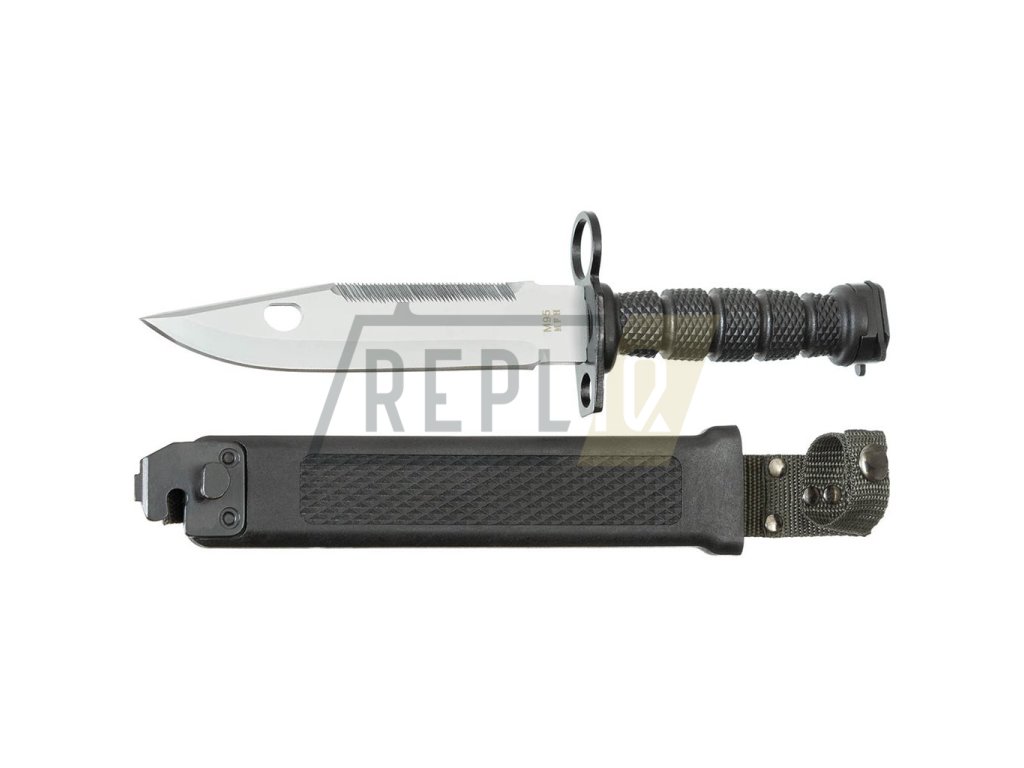 Plastové pouzdro s polyesterovým popruhem můžete navléci na opasek. Rukojeť bajonetu je v pouzdře zajištěna popruhem s drukem. Na zadní straně pouzdra najdete brusný kámen.