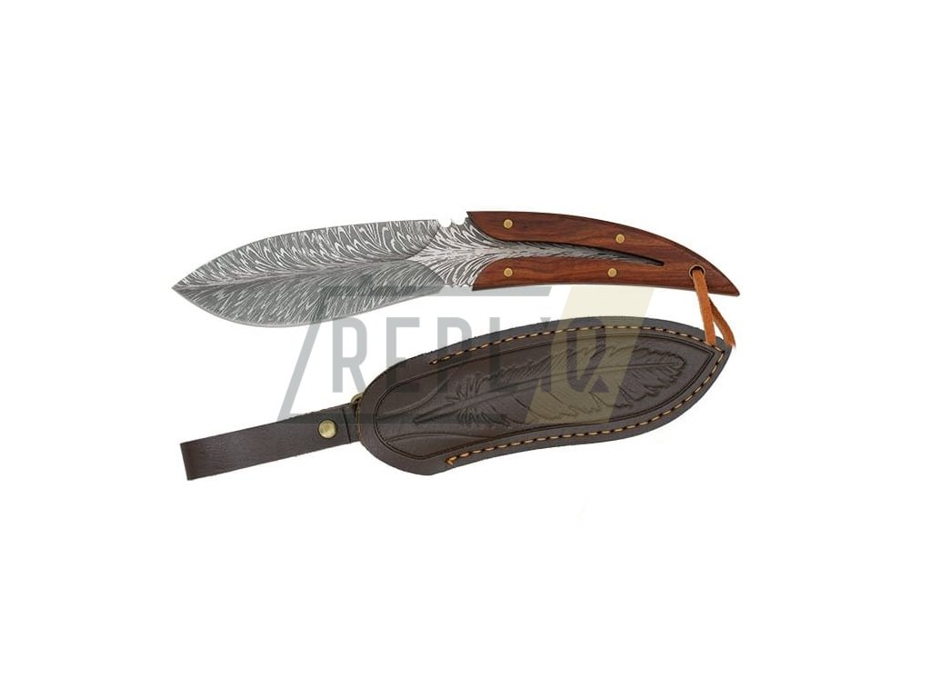 Netradičně vypadající nůž s pevnou čepelí dodávaný s koženým opaskovým pouzdrem. Čepel s hladkým ostřím je vyrobená z nerezové oceli s potiskem připomínajícím ptačí pera. Střenky poměrně výrazně zakřivené rukojeti jsou vyrobené ze dřeva. Na konci rukojeti naleznete otvor s provlečenou pojistnou šňůrou.
