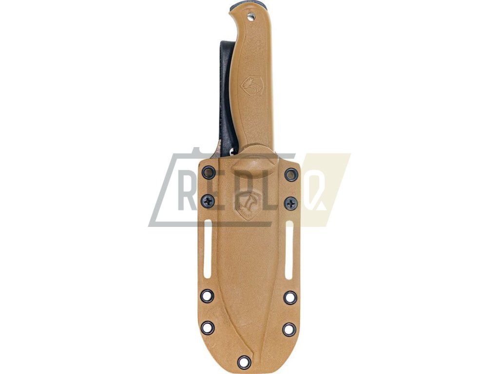 Čepel je s povrchovou úpravou Cerakote®, která zajišťuje lepší ochranu proti korozi. Příjemně tvarovaná rukojeť je vyrobená z vysoce odolného termoplastu, který je odolný vůči poškrábání a vysokým teplotám. Na konci rukojeti najdete otvor pro možnost provlečení provázku.