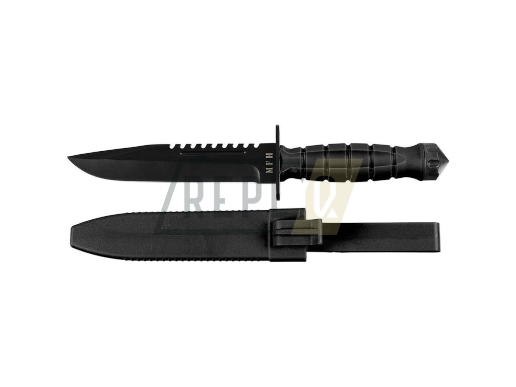 Nůž s černěnou pevnou čepelí vyrobenou z nerezové oceli 3Cr13. Čepel je opatřena hladkým ostřím a na hřbetní straně praktickou pilkou. Plastová rukojeť je příjemně tvarovaná, opatřena perforovanou záštitou a na jejím konci naleznete rozbíječ skla. K noži je dodáváno plastové pouzdro určené k připevnění na opasek.