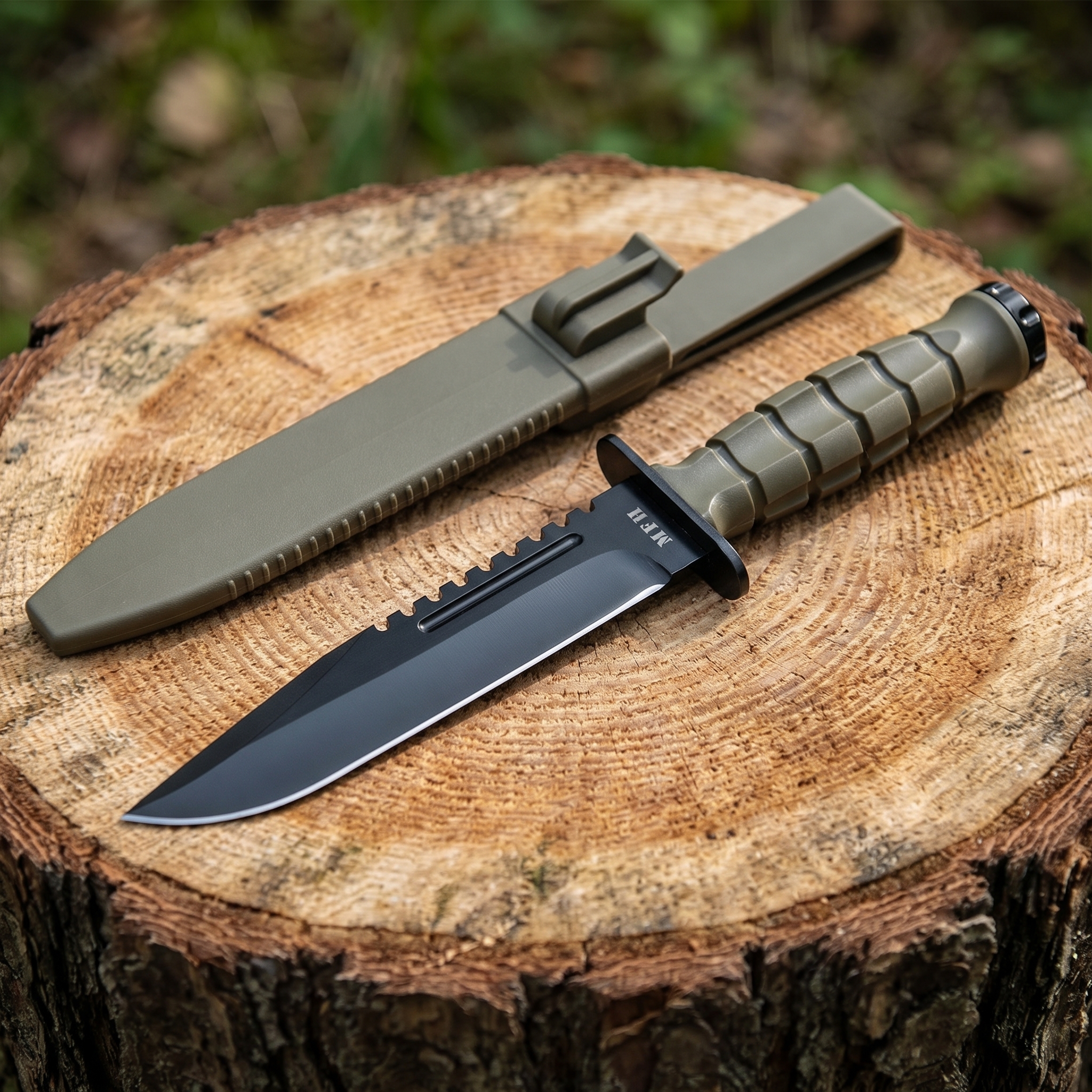 Nůž s černěnou pevnou čepelí vyrobenou z nerezové oceli 3Cr13. Čepel je opatřena hladkým ostřím a na hřbetní straně praktickou pilkou. Plastová rukojeť je příjemně tvarovaná, opatřena perforovanou záštitou a na jejím konci naleznete rozbíječ skla. K noži je dodáváno plastové pouzdro určené k připevnění na opasek.