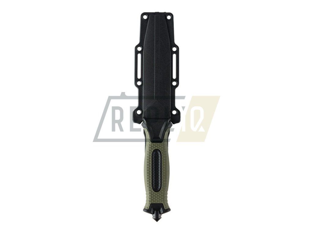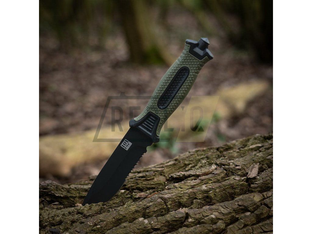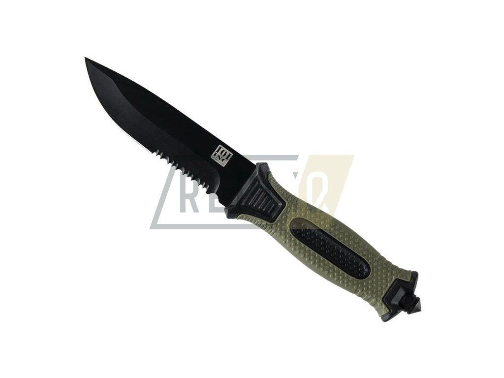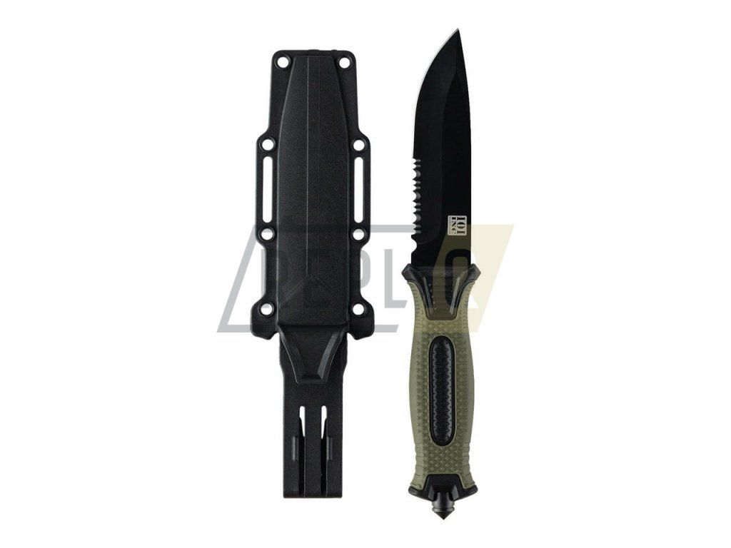 Taktický nůž s kombinovaným ostřím dodávaný s praktickým plastovým pouzdrem na pohodlné přenášení. Černěná čepel tvaru Drop point je opatřena zoubkovaným ostřím a na její výrobu byla použita nerezová ocel 3Cr13SS. Rukojeť je tvarovaná pro pohodlný úchop, střenky jsou vyrobené z plastu a konec nože opatřen nouzovým rozbíječem skla.