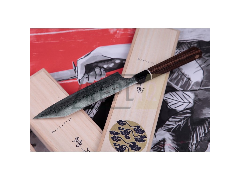 Nůž KIRITSUKE/Santoku ZUIUN má ultra ostré řezné jádro z japonské práškové oceli SPG2, které je velmi dobře chráněno proti korozi. Japonská prášková ocel SPG2 má dlouhotrvající ostrost při tvrdosti R63 +/- 1 Rockwella. Jádro z japonské práškové oceli SPG2 je vloženo mezi 62 vrstev 2 nerezových damascénských ocelí (damascus steel), které zajišťují mimořádnou odolnost a houževnatost. Dokonale vyvážená, přesně zúžená čepel japonského tvaru s třpytivým damascénským vzorem minimalizuje tření při řezu a zabraňuje přilepení krájeného materiálu k čepeli. připomínající vlnky na povrchu písečných dun v poušti je jedinečný, neopakovatelný a stane se symbolem Vaší individuality.