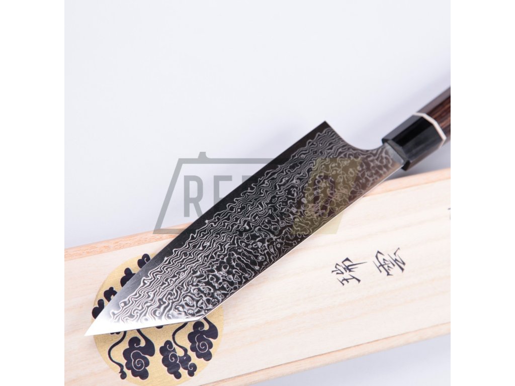 Robustní, velmi ostrý japonský nůž KIRITSUKE/Santoku 180 mm z rychlořezné práškové oceli SPG2 s působivým designem a nejvyšší kvalitou. Tento nůž je bezohledný kuchyňský válečník, který je připraven na všechna vaše přání. Japonské slovo "santoku" se zhruba označuje jako "tři ctnosti", což svědčí o všestrannosti tohoto nože. Čepel je obvykle kratší než kuchařský nůž s výrazně odlišnou geometrií. Nůž Santoku je často prohlašován za fúzi mezi šéfkuchařským nožem a nakiri, což vám přináší výhody obou zmíněných. Vyšší faseta snižuje tření, krájení je tak přesnější. SANTOKU je dokonalým společníkem při práci s masem, rybami, zeleninou a ovocem. Jelikož je špička čepele modelována podle japonského meče, je vhodná i pro přípravu pokrmů, které vyžadují použití špičky a také pro dekorativní vyřezávání. Japonské umění, preciznost a nové technologie činí tento nůž z práškové damaškové oceli (damascus steel) jedinečným a nenapodobitelným.