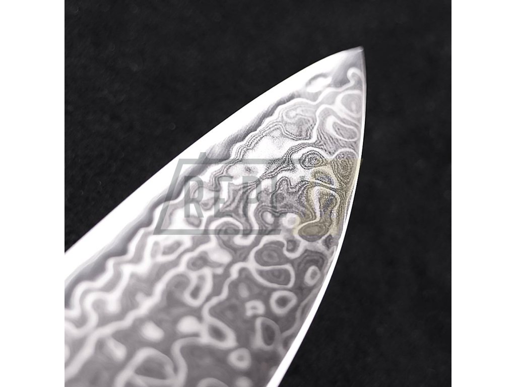 Čepel tohoto nože je vyrobena z oceli Böhler M390, která je známá svou extrémní odolností proti opotřebení, výjimečnou schopností udržet ostří a vysokou odolností vůči korozi. Tvrdost jádra tohoto nože dosahuje úctihodných hodnot okolo 62 HRC. Díky této špičkové oceli zůstává nůž dlouho ostrý, a to i při intenzivním používání. Damaškový vzor "Mizu no Mai" 水の舞 (Tanec vody) dodává čepeli jedinečnou estetickou hodnotu, díky které je každý nůž originálním uměleckým dílem.