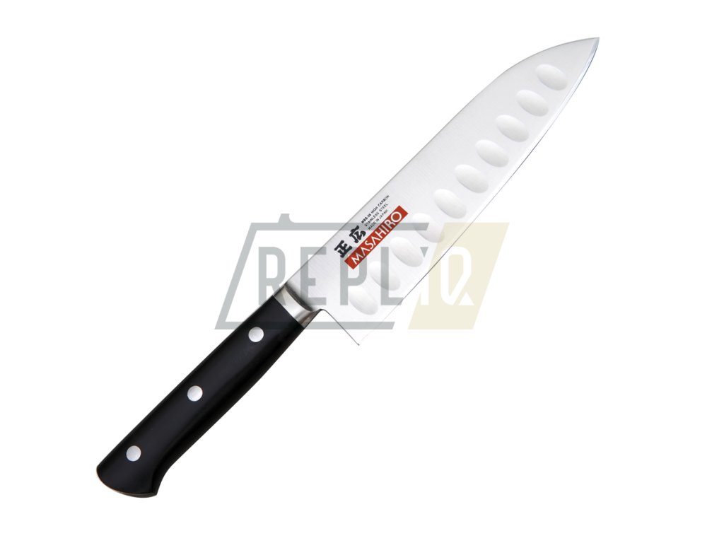 Masahiro MV-H Santoku Dimple s délkou čepele 175 mm je tradiční japonský nůž, který je často označován jako ekvivalent západního kuchařského nože. Japonský název tohoto velmi oblíbeného nože znamená "tři vlastnosti" nebo "tři ctnosti". Tento nůž, jehož charakteristický vzhled připomíná kombinaci kuchařského nože a sekáčku, je ideální pro krájení masa, ryb a zeleniny.