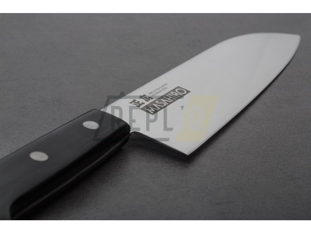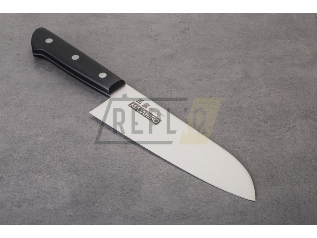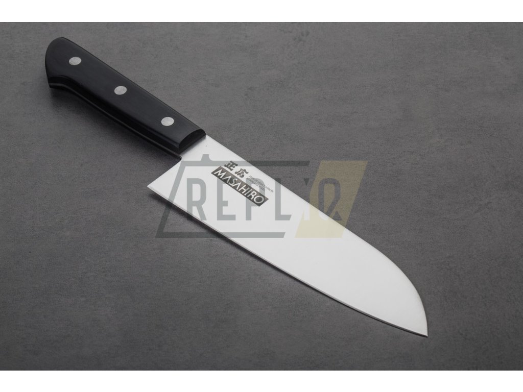 Masahiro MV-L Santoku s délkou čepele 175 mm je tradiční japonský nůž, který je často označován jako ekvivalent západního kuchařského nože. Japonský název tohoto velmi oblíbeného nože znamená "tři vlastnosti" nebo "tři ctnosti". To znamená, že tento nůž, jehož charakteristický vzhled připomíná kombinaci kuchařského nože a sekáčku, se velmi dobře hodí ke krájení masa, ryb a zeleniny.