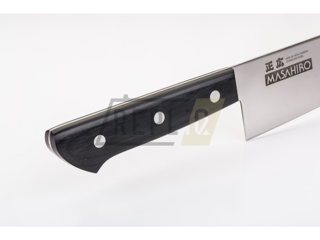 MV-L je nejnovější skupina nožů vyráběných společností Masahiro a jeho prototypem je řada BWH. Molybden-vanadová nerezová ocel s vysokým obsahem uhlíku se používá také při výrobě MBS-26který prošel třístupňovým procesem kalení, dokud nedosáhne tvrdosti 58-59 HRC. Stejně jako všechny čepele vycházející z továrny Masahiro je i tato dovedena k dokonalosti řemeslníky s více než 30 lety zkušeností.