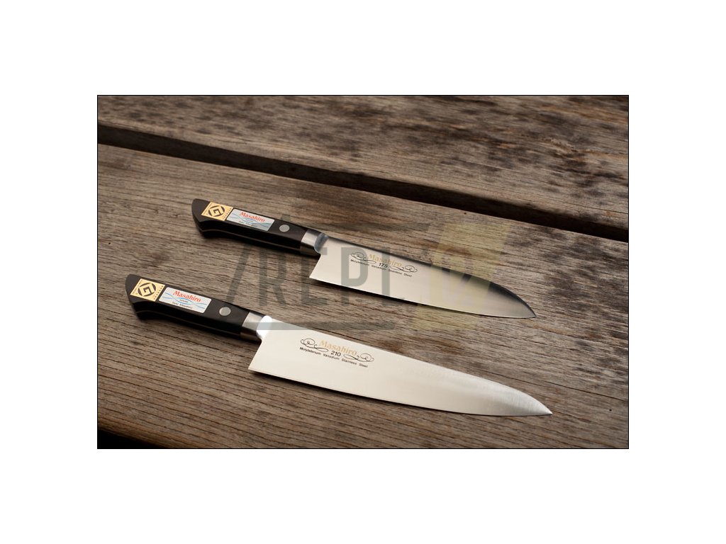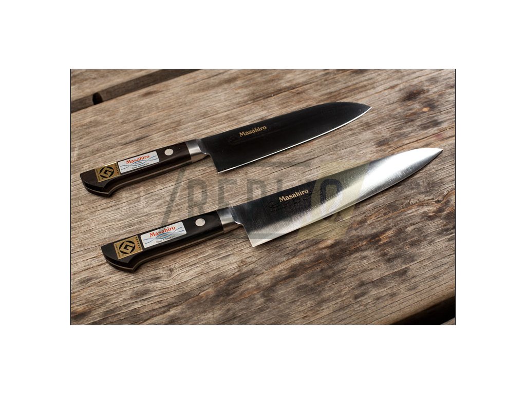Masahiro MV Santoku s délkou čepele 175 mm je tradiční japonský nůž, který je často označován jako ekvivalent západního kuchařského nože. Japonský název tohoto velmi oblíbeného nože znamená "tři vlastnosti" nebo "tři ctnosti". To znamená, že tento nůž, jehož charakteristický vzhled připomíná kombinaci kuchařského nože a sekáčku, se velmi dobře hodí ke krájení masa, ryb a zeleniny.