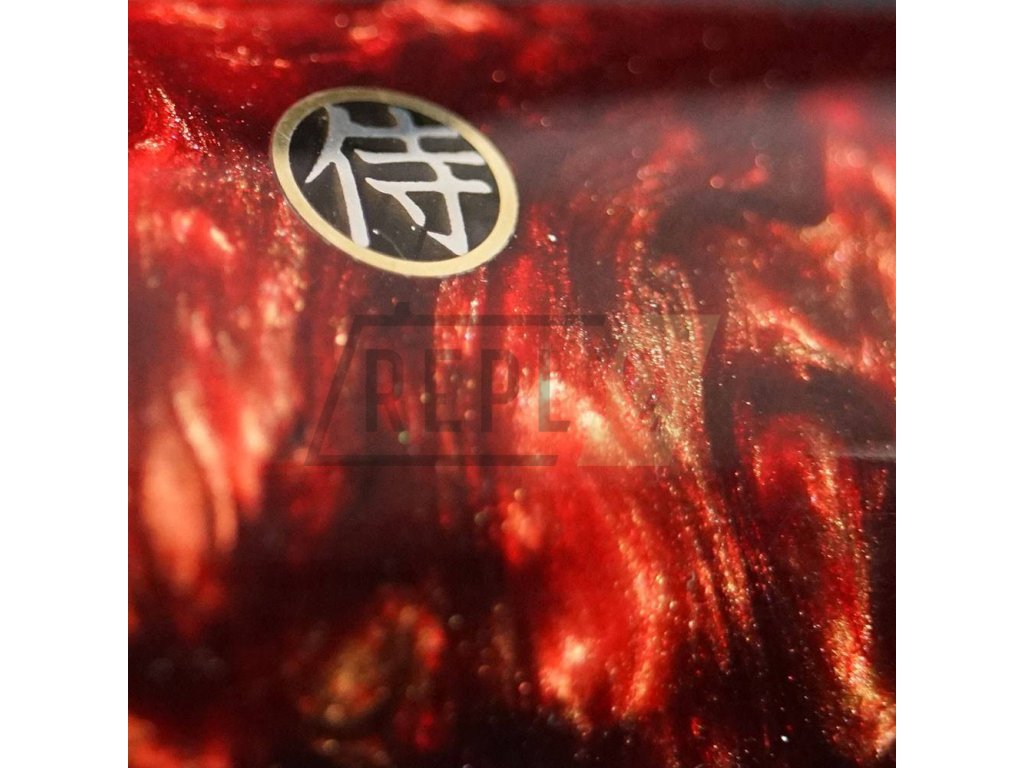 Rukojeť je vyrobena z překrásné epoxidové pryskyřice. Jedná se o průhlednou pryskyřici probarvenou alkoholovými pigmenty, které mohou časem měnit barvu. Navíc je ozdobená středovým mozaikovým nýtem se znakem samurajů. Trojité nýtování zajišťuje dokonalou pevnost, stabilitu a spojení damaškového ostří a rukojeti. Rukojeť je pečlivě ručně leštěná, ergonomicky tvarovaná a navržená pro vynikající ruční ovládání. Speciálně navržený tvar rukojeti je vhodný pro asijský úchop nože. Pryskyřice je voděodolná a zcela bez zápachu, nevyžaduje prakticky žádnou údržbu. Nezačne v průběhu času korodovat, oxidovat, zůstane stejně tvrdá a pevná.