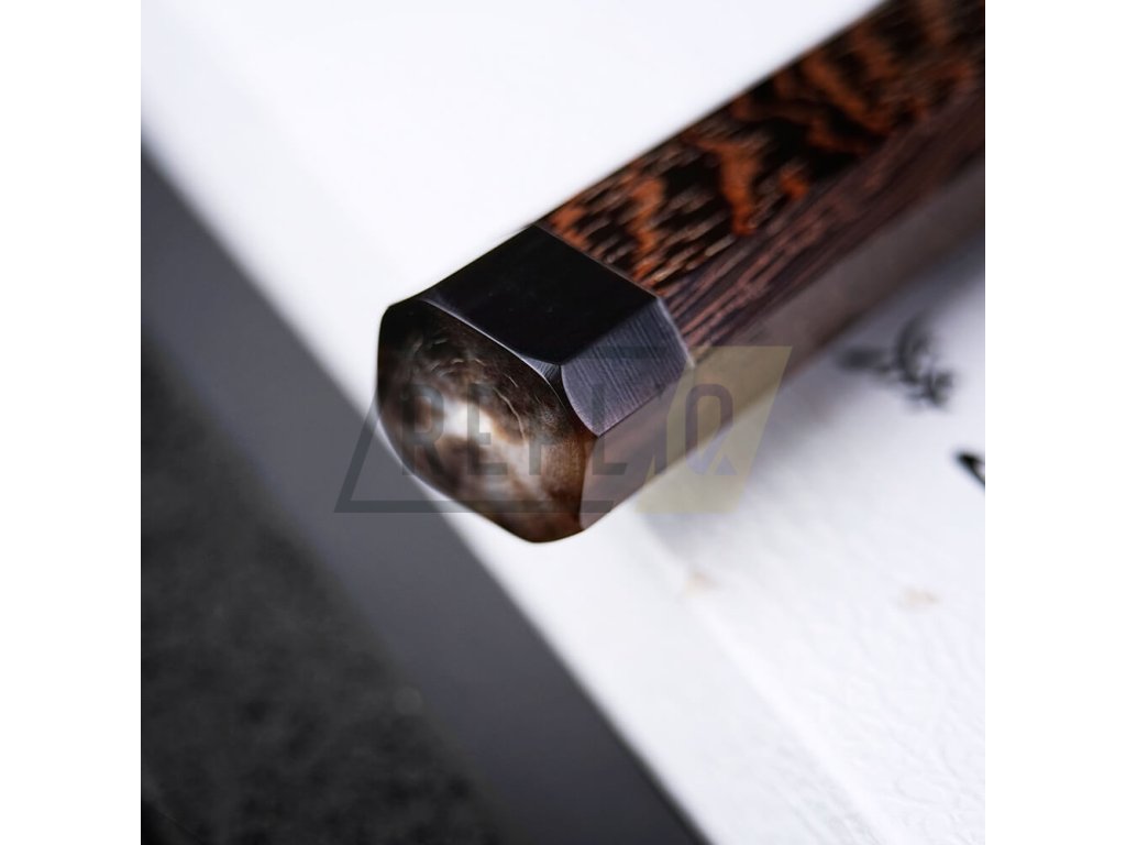 Čepel tohoto nože je opravdovým skvostem řemeslného umění. V jejím srdci se nachází jádro z uhlíkové oceli Blue Steel, známé svou vynikající tvrdostí a schopností udržet ostrou hranu i při náročném použití. Tento materiál je ceněný pro svou dlouhou životnost a ostrost, což činí čepel ideální pro precizní řezání. Navíc je čepel z jedné strany elegantně zahalena damaškovou ocelí, která nejen přispívá k estetickému vzhledu díky unikátním vzorům, ale také zvyšuje pevnost a flexibilitu čepele. Kombinace těchto materiálů dává čepeli nejen působivý vzhled, ale také skvělou funkčnost, která uspokojí jak profesionály, tak nadšené kuchaře. Výborně se hodí k broušení na vodních kamenech.
