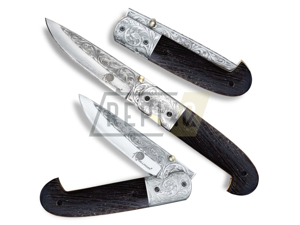 Zavírací lovecký nůž Dellinger Kizama D2 Wenge představuje zdobenou variantu oblíbeného modelu Dellinger Sentinell. Jedná se o kovanou čepel z nástrojové oceli D2, která je ručně zdobena rytinami jak na čepeli, tak i na bolstru (záštitě). Čepel je vybavena oboustranným kolíčkem pro pohodlné otevírání jednou rukou. Rukojeť (střenka) je pečlivě opracována z kartáčovaného dřeva Wenge. Při výrobě tohoto nože byly uplatněny tradiční kovářské techniky a metalurgické vytvrzení oceli na cca 60 HRC. Tento praktický zavírák poskytuje spolehlivý výkon a usnadňuje širokou škálu pracovních úkolů. Čepel je pevně zajištěna pojistkou Liner-Lock proti samovolnému zavření.