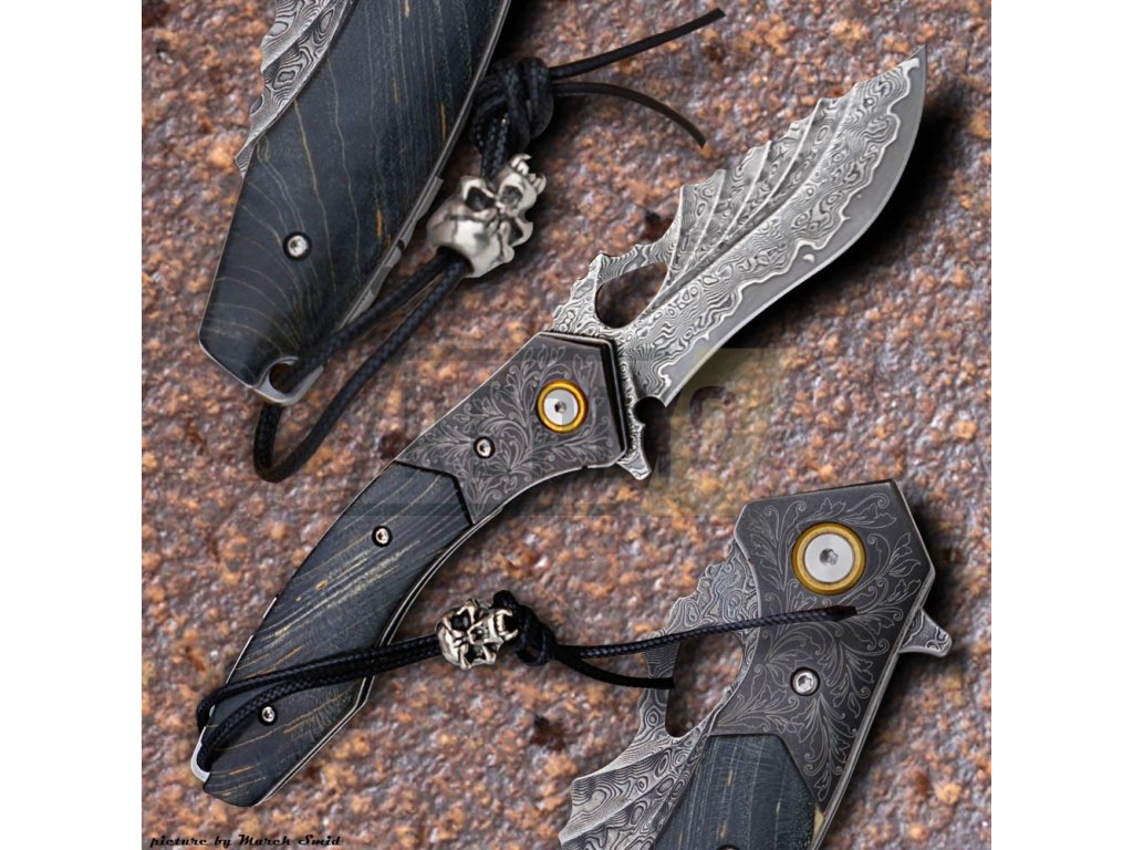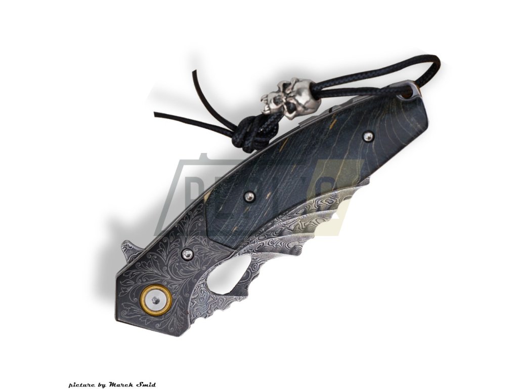 Zavírací nůž Dellinger Nautilus má ostré řezné jádro z damaškové oceli VG-10vložené mezi 66 vrstev 2 nerezových damaškových ocelí. Díky tomu dosahuje tvrdosti kolem 61 HRC, proto je nůž mimořádně ostrý po dlouhou dobu. Navíc vrstvená damašková ocel působí prostě nádherně. Čepel je uložena v keramických ložiscích, díky čemuž je otevírání snadné a plynulé. Pojistka liner lock zajišťuje, že se nůž samovolně nezavře a vy se na něj tak můžete vždy spolehnout. Tento nůž patří do skupiny EDC, můžete ho nosit u sebe při každé příležitosti. Rukojeť je ze dřeva stabilizovaného topolu. Stabilizované znamená, že dřevo je napuštěné epoxidovou pryskyřicí, díky které je pak odolné vůči vodě, nesmršťuje se, nepraská a lze jej snadno tvarovat do požadovaných tvarů. Nůž je dodávaný s pouzdrem z kvalitní kůže. Nůž se výborně hodí ke zpracování černé zvěře.