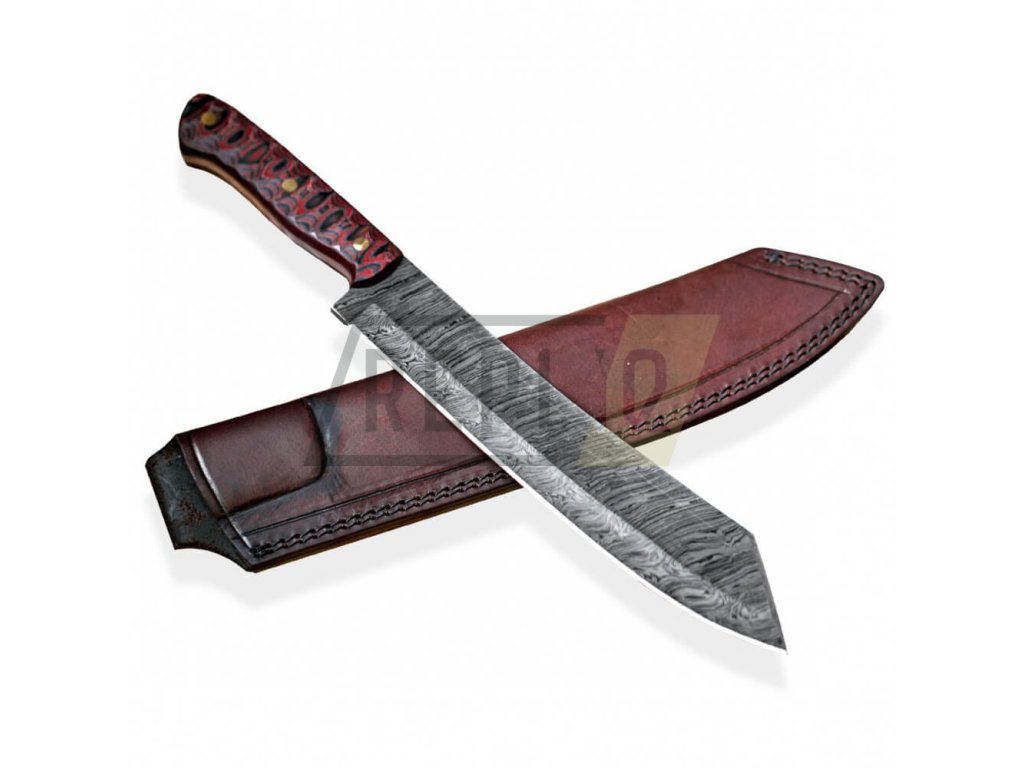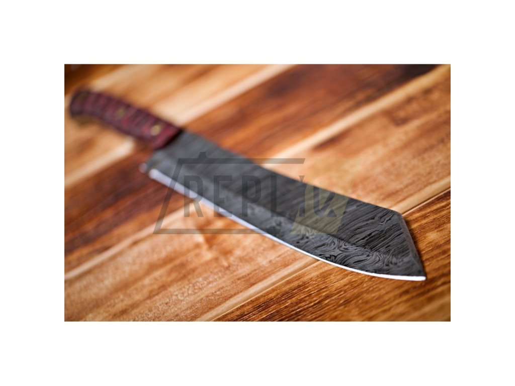 Ručně kovaná a zpracovaná z damaškové uhlíkové oceli ve full tang konstrukci s odolnou rukojetí z mikarty. Kresba vytvořená na povrchu čepele je jedinečná a vyniká hloubkou profilu jednotlivých vrstev. Houževnatost a odolnost vůči opotřebení je samozřejmostí. Damašková uhlíková ocel není nerezová a proto vykazuje určitou citlivost na oxidaci. Pravidelná údržba, včetně olejování a udržování sucha, může pomoci minimalizovat riziko koroze. Využít mačetu můžete jak v kuchyni, na krájení a sekání zeleniny, masa a kostí, tak pro práce venku, jako je úprava zahrady, nebo příprava dřeva pro oheň. Je to silný nástroj s dlouhou a širokou čepelí, což umožňuje provádět silné řezy a snadno pronikat do husté vegetace.