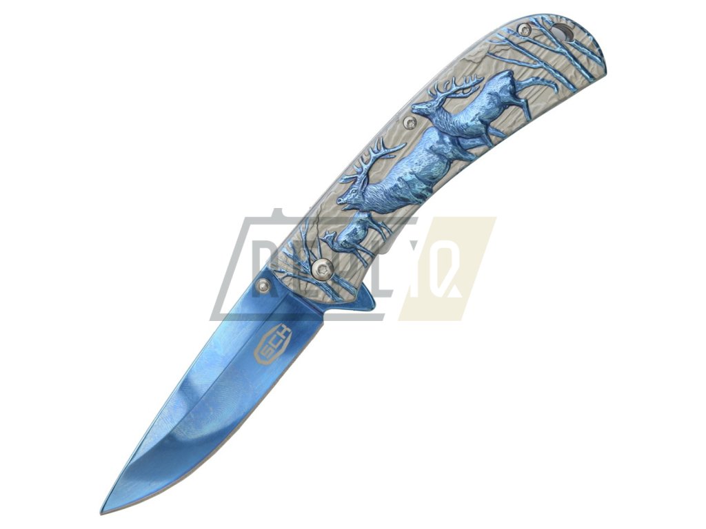 Kapesní nůž značky Steel Claw Knives se zavírací čepelí, flipperovým otevíráním a kovovou rukojetí.Čepel nože Blue Deer z materiálu Stainless Steel 420 má délku 85 mm a hladké ostrí s klasickou Drop Point špičkou a modrým coatingem.