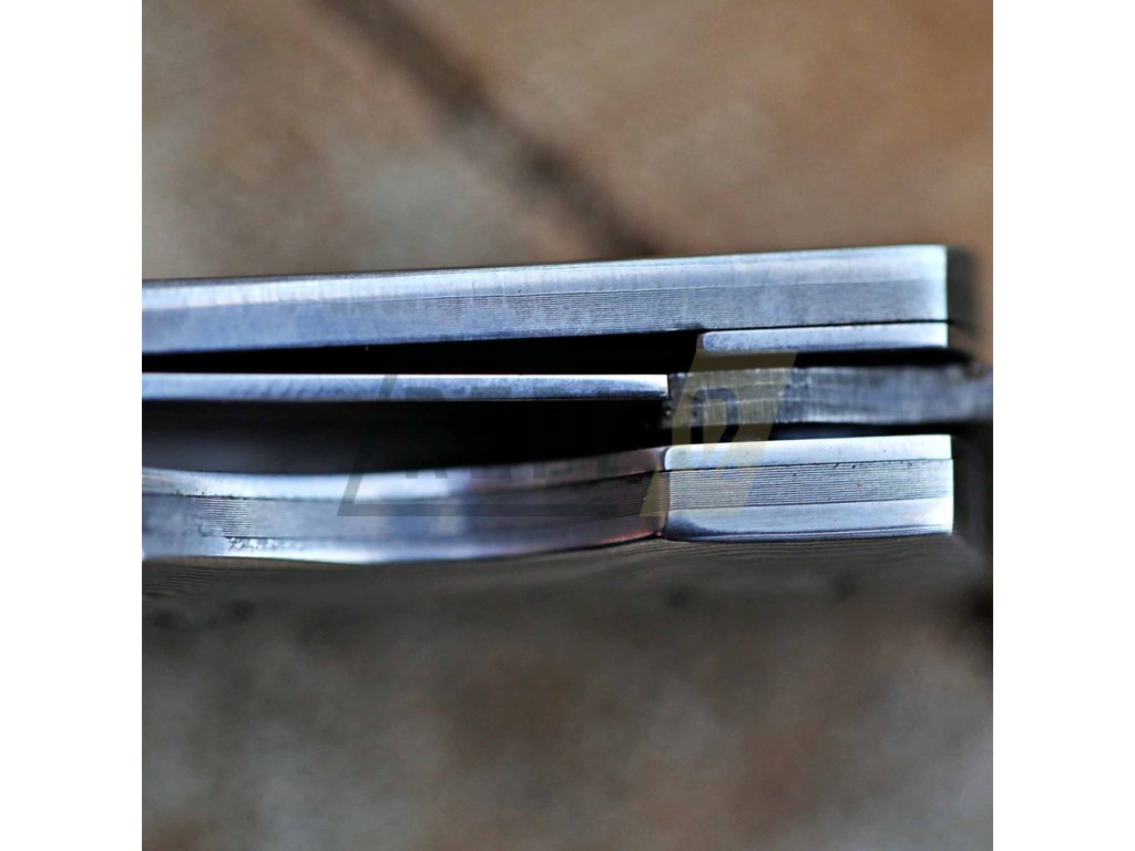 Čepel zavíracího nože Dellinger Weidmann má řezné jádro z oceli VG-10 vložené mezi 66 vrstev 2 nerezových damaškových ocelí. Ocel dosahuje tvrdosti až 60 HRC, je velmi odolná proti opotřebení či korozi a snadno se brousí. Čepel je uložena v kuličkových ložiscích a pevně zajištěna pojistkou liner lock proti samovolnému zavření. Rukojeť je vyrobena z paroží, bolster je z damaškové oceli. Nůž je dodávaný s koženým pouzdrem.