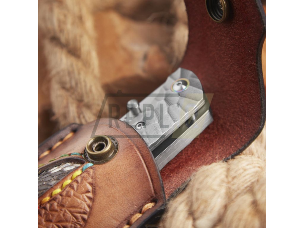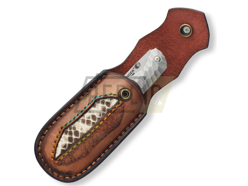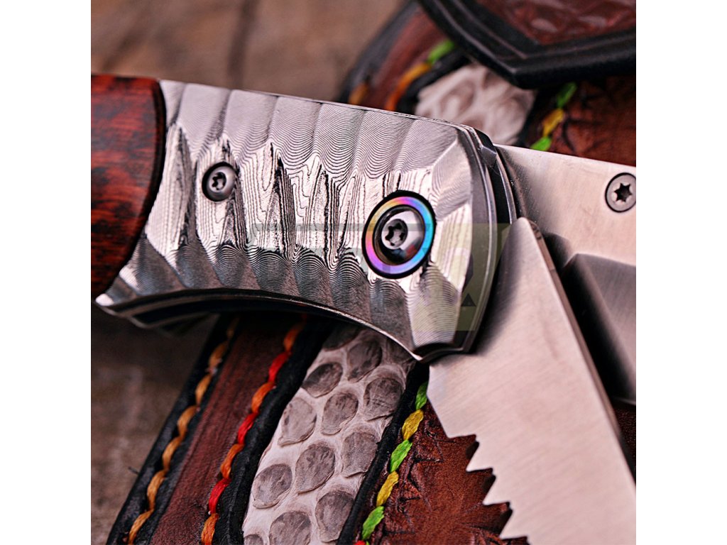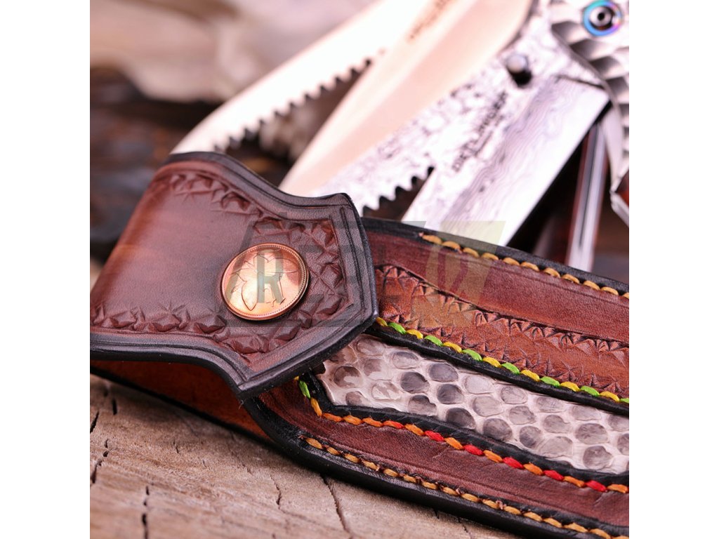 Rukojeť je z pravého hadího dřeva s masivním kováním typu obsidián z damaškové oceli s kroužkem z titanu, což mu dodává luxusní a originální vzhled. Nůž je dodávaný s pouzdrem z kvalitní hovězí kůže doplněné kůží kobří.