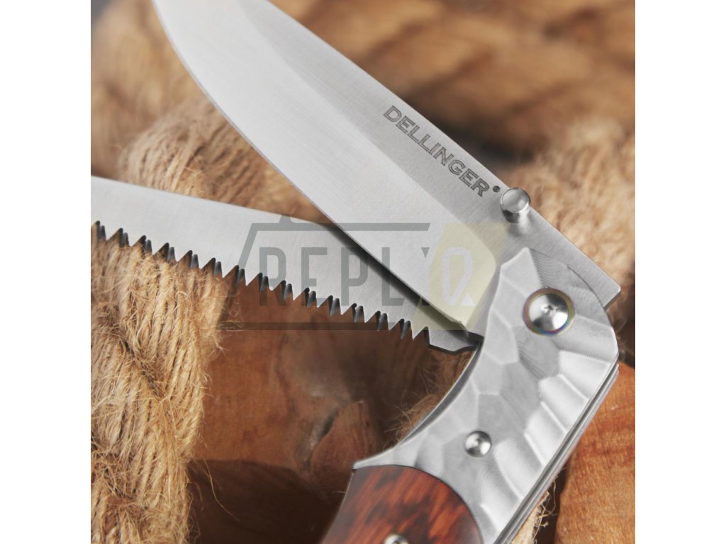 DELLINGER Wilderer je ideální lovecký nůž ze skupiny EDC nožů. Má dvě čepele. Jednu ostrou, se kterou nebude žádné krájení, sekání či kuchání problém. Druhou čepelí je potřebná lovecká pilka se dvěma řadami zubů, se kterými nebude problém rozříznout zámek u jakéhokoliv zvířete. Čepel i pilka jsou z práškové oceli M390 Bohler Microclean. Ocel dosahuje tvrdosti až 62 HRC, je velmi odolná proti opotřebení či korozi a snadno se brousí. Čepel je uložena v kuličkových ložiscích a pevně zajištěna pojistkou linerlock proti samovolnému zavření. Pilka je polouzamčená, v otevřené poloze pevně drží, i když není vybavena pojistkou, a lze ji pohodlně otevřít za špičku.