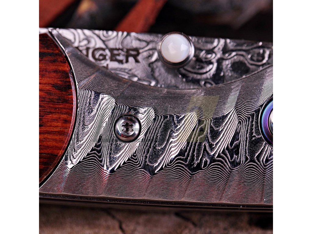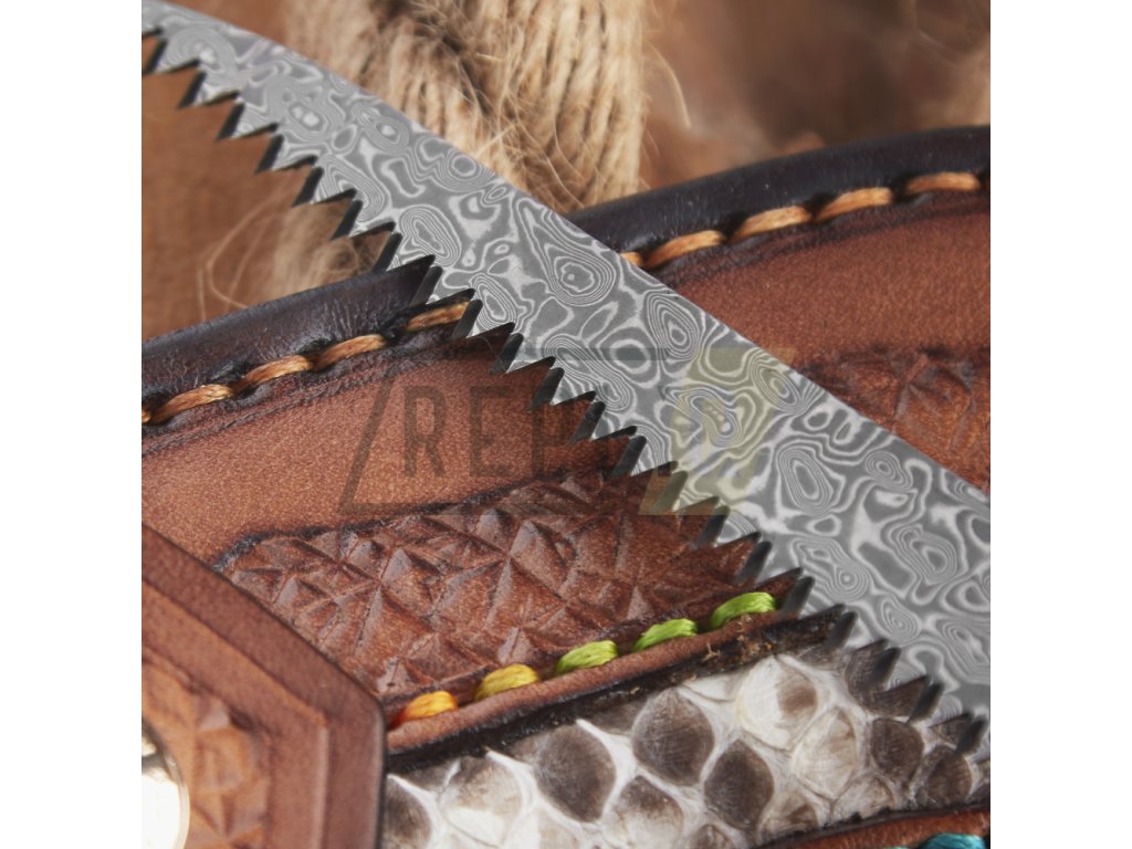 Rukojeť je z pravého hadího dřeva s masivním kováním typu obsidián z damaškové oceli s kroužkem z titanu, což mu dodává luxusní a originální vzhled. Nůž je dodávaný s pouzdrem z kvalitní hovězí kůže doplněné kůží kobří.