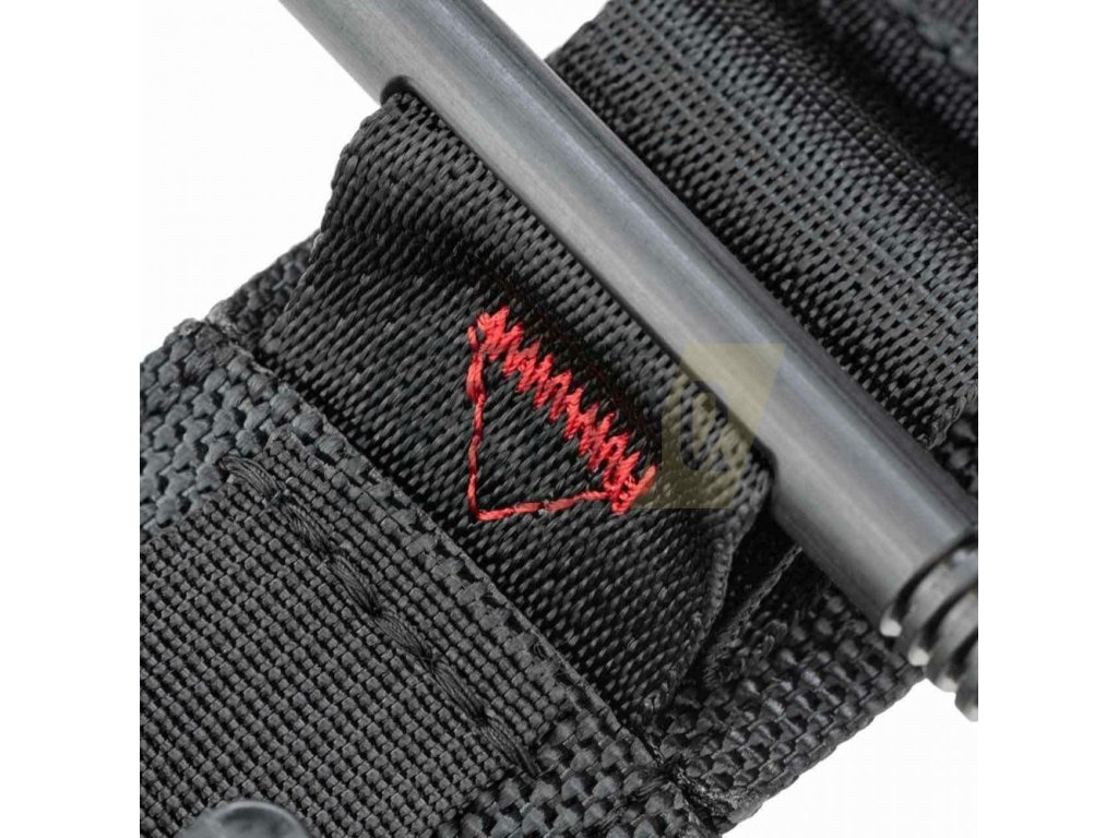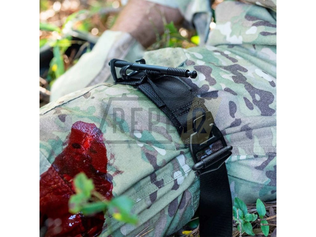 - Indikační klín - všitý do "Performance Compression Band" pásky pod vratidlem. Kontrastní klín nabízí vizuální potvrzení, že jste beze zbytku při nasazení škrtidla na končetinu stáhli na maximum veškerý volný pás. Toto je kritický krok pro správnou aplikaci turniketu a výsledkem je méně rotací vratidla potřebných k dosažení okluze.