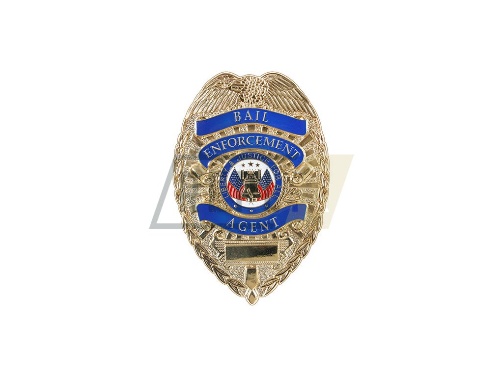 Kovový odznak s nápisem BAIL ENFORCEMENT AGENT.