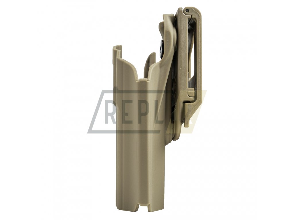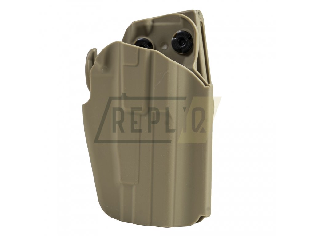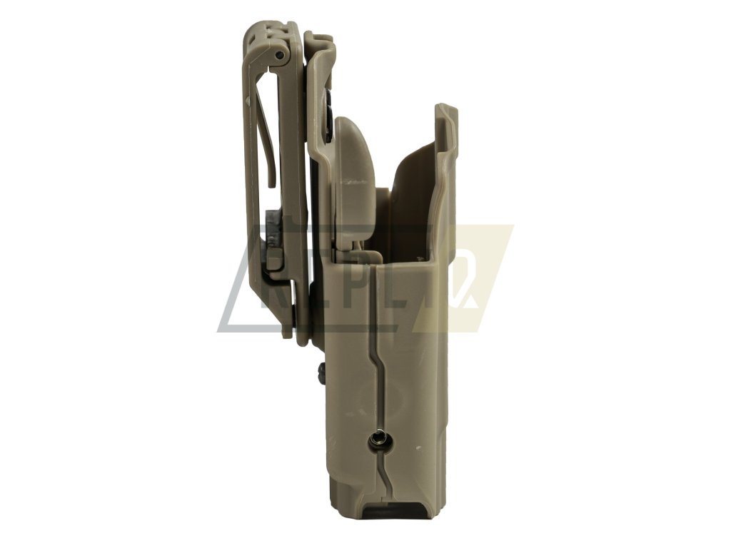 Vnější opaskové plastové pouzdro značky FMA pro praváky. Vybavené pojistkou, která automaticky zachytí lučík zbraně při vložení do pouzdra. Pojistka se odjišťuje odpruženou pákou, její umístění umožňuje ji stisknout prostředníkem střílející ruky při zachování správného úchopu pažbičky zbraně. Míru sevření zbraně je možné regulovat šroubem na boku pouzdra pomocí přiloženého imbusového klíče. Pouzdro se připevňuje k opasku provlečením skrze plastový adaptér, šířka průvleku je nastavitelná v rozpětí 38-55 mm. Pouzdro je možné vůči adaptéru / opasku v omezené míře naklápět.