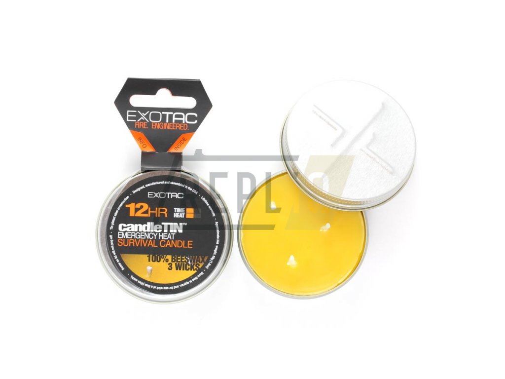Exotac candleTIN je série čtyř svíček s různými vlastnostmi a různou možností využití. Všechny typy sdílejí mimořádně kvalitní vosk, tři knoty pro nastavitelnost plamenu a lehký, pevný obal chránící vosk před okolním prostředím.