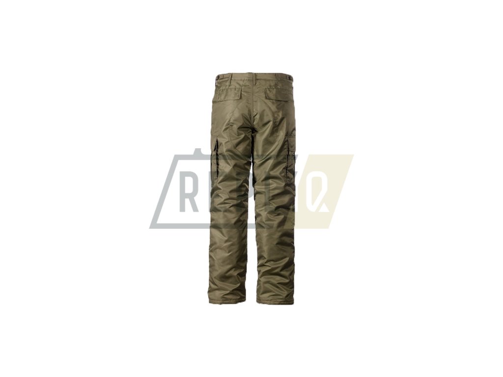 Dvě průhmatové kapsy vpředu, dvě kapsy vzadu kryté patkami, dvě velké (vakové) kapsy na bocích stehen, rovněž kryté patkami. Zapínání poklopce a patek kapes na knoflíky. Stahovací pásky pro pohodlnou úpravu šířky v pase, praktické tkaničky na stažení konců nohavic. Možnost použití opasku. Zpevněné oblasti kolen a sedu zdvojením materiálu.
