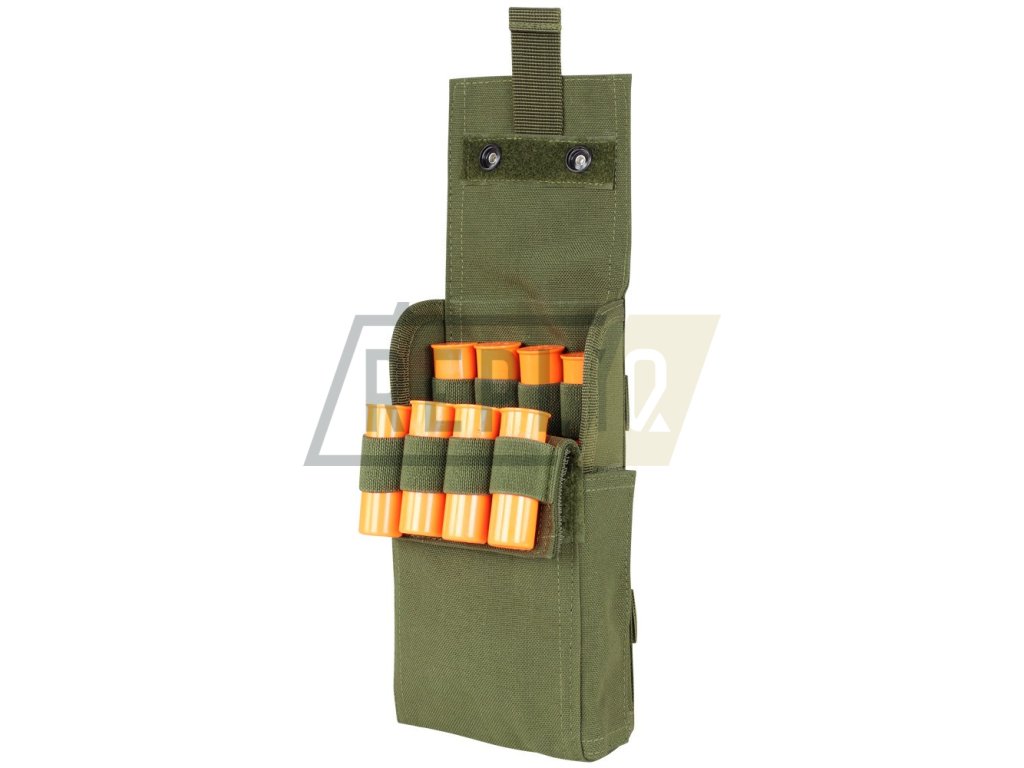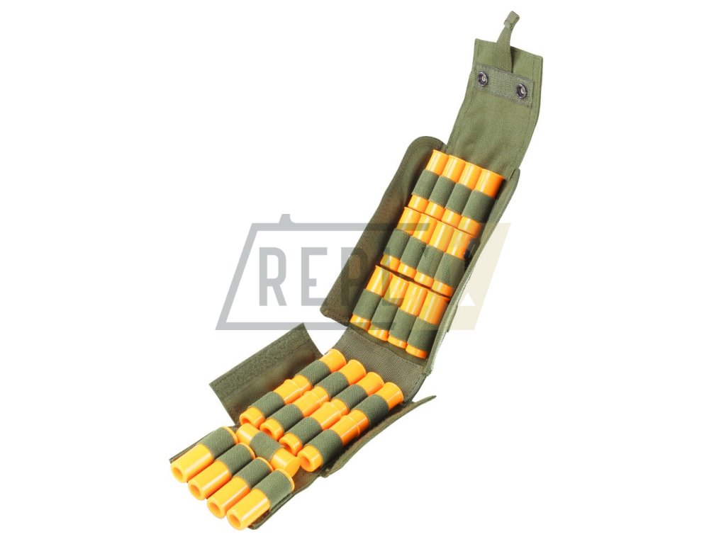 Promyšlené rozevírací pouzdro na brokové náboje. Pro přístup k první řadě nábojů není nutné otvírat celou sumku, stačí odklopit horní víko a část přední strany. Na 25 nábojů do brokovnice. Zavírání na suchý zip a patentky.