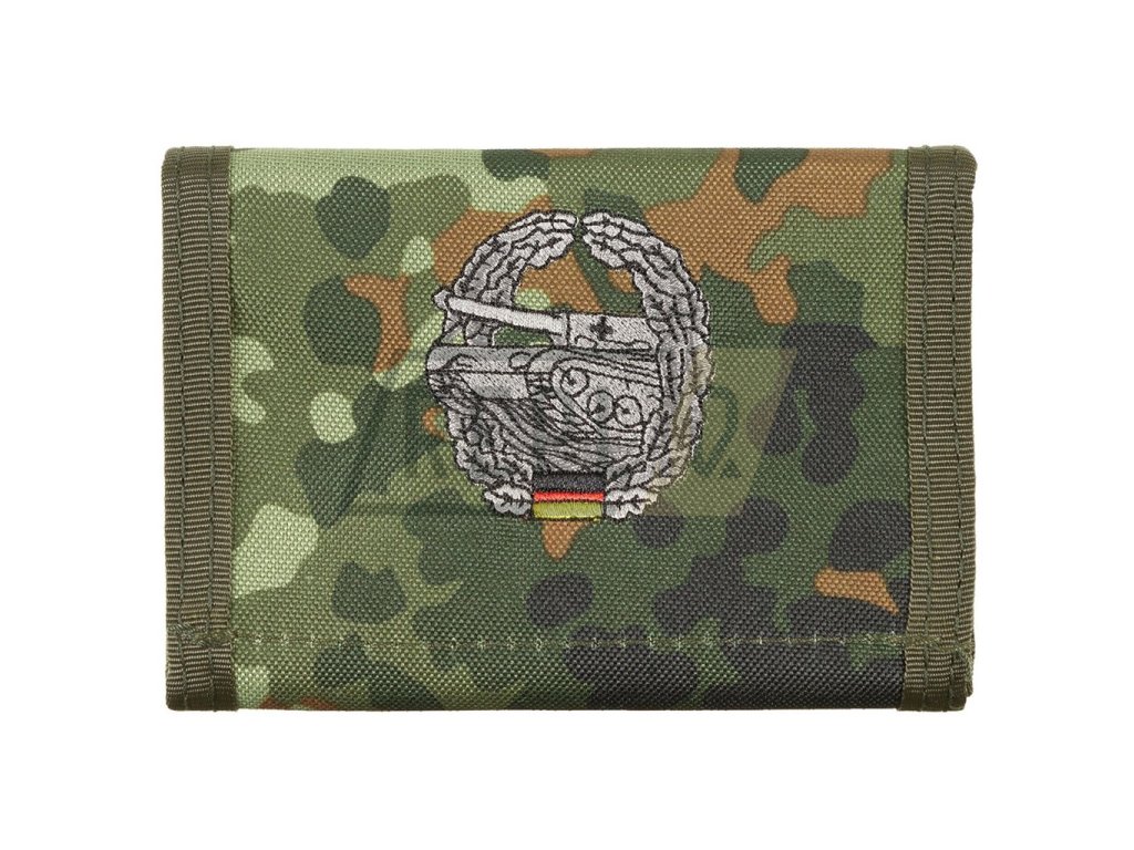 Nylonová army peněženka s maskovacím vzorem Flecktarn s vyšitým znakem příslušného armádního útvaru německého Bundeswehru.