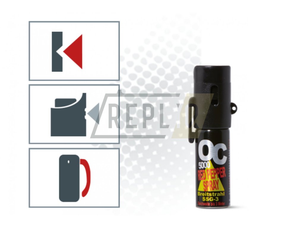 Kapesní pepřový sprej OC 5000 SSG 3 se osvědčí jako příruční ochranný prostředek, který můžete snadno přenášet v kapse nebo kabelce. Přenášení usnadňuje integrovaný klips.V jeho útrobách se nachází 15 ml dráždivé látky OC (oleoresin capsicum - alkalický kapsaicin), která způsobuje slzení, podráždění kůže a pálení sliznic.