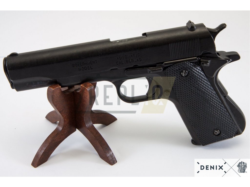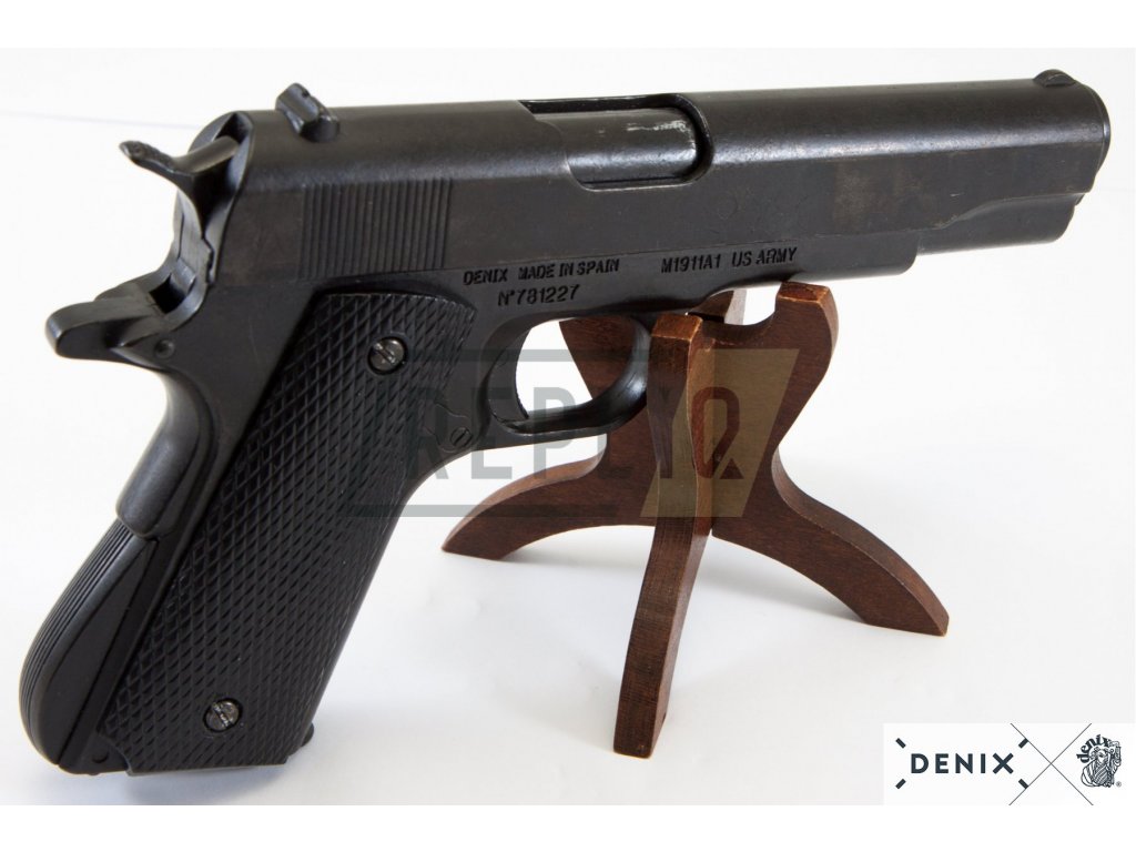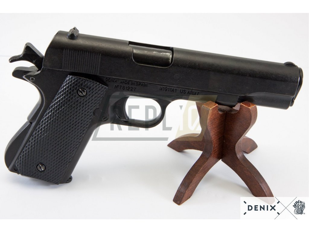 Reprodukce zbraně, vyrobená z kovových částí a plastových rukojetí, se simulovaným mechanismem natažení. Stojánek není součástí.