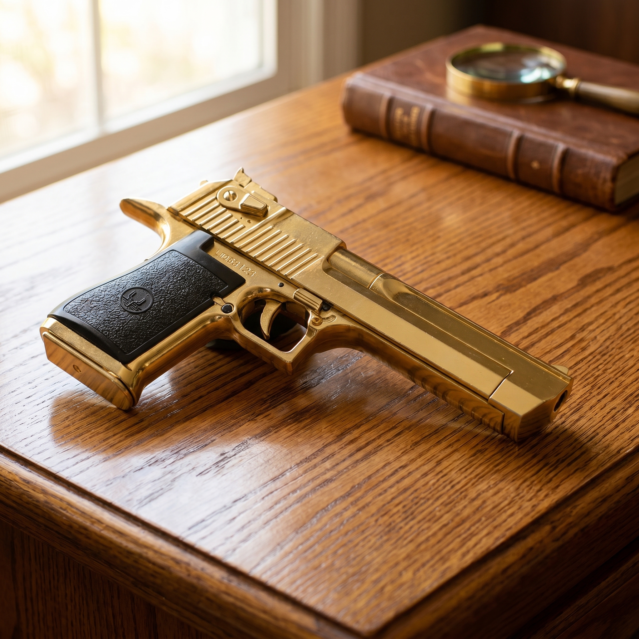 Tuto pistoli mohli diváci vidět přímo ve filmu Deadpool & Wolverine, kde se stala součástí ikonické výzbroje. Model tak spojuje filmovou kulturu s moderním zbraňovým designem a patří mezi vyhledávané repliky pro fanoušky akčních hrdinů. Pistole je dekorativní a nefunkční, určená především pro sběratelské a výstavní účely. Doporučujeme doplnit o stojánek na pistole, díky kterému zlatý povrch i detaily ještě lépe vyniknou.
