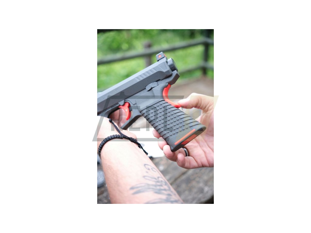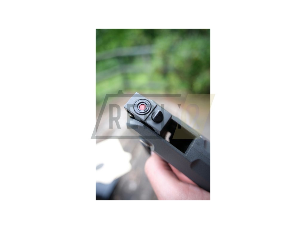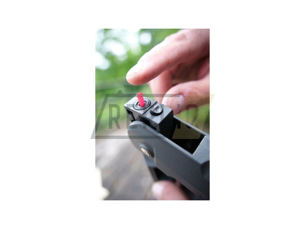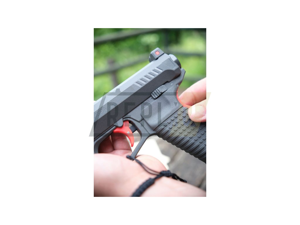 Pistole je vybavena dvojím jištění spouště. Jedna pojistka se nachází nad rukojetí a má pobodu manuálně ovládaného přepínače vpřed a vzad. Posunem přepínače vpřed pistoli zajístíte a posunem vzad odjistíte. Dále na pistoli UX SPA 100 najdete dlaňovou pojistku integrovanou do hřbetu rukojeti. Spoušť jde tedy zmáčknout pouze v případě držení rukojeti.